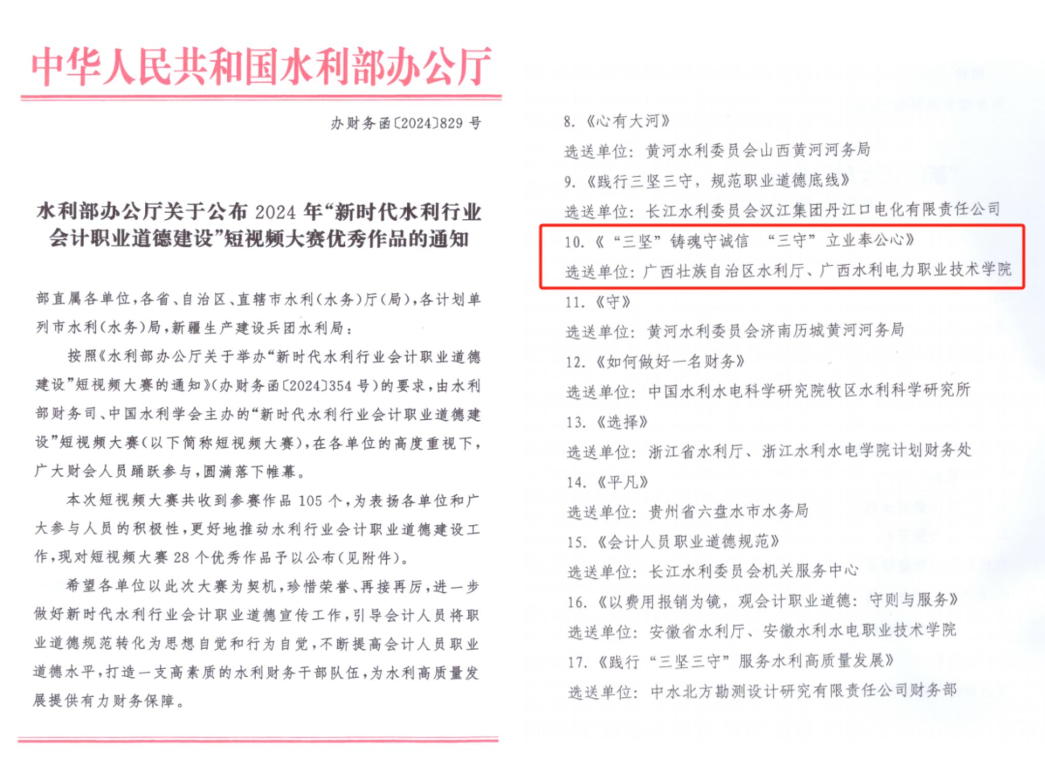 [本网讯]近日,由水利部财务司、中国水利学会主办的“新时代水利行业会计职业道德建设”短视频大赛落下帷幕。此次比赛共收到全国各单位参赛作品105个,最终评选出28个优秀作品。学校财务处与自治区水利厅联合出品《“三坚”铸魂守诚信 “三守”立业奉公心》的短视频荣获水利部优秀作品奖。