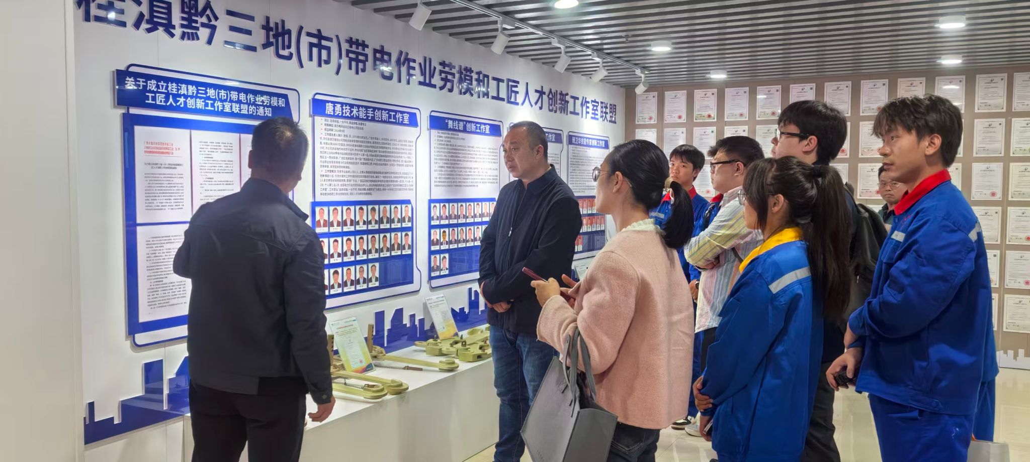 在参观环节中,了解了该公司谭永殿劳模创新工作室、谭敏劳模工作室、唐勇劳模创新工作室的创建过程和取得的成果;并学习探讨了桂滇黔三地(市)带电作业劳模和工匠人才创新工作室联盟的运行机制。