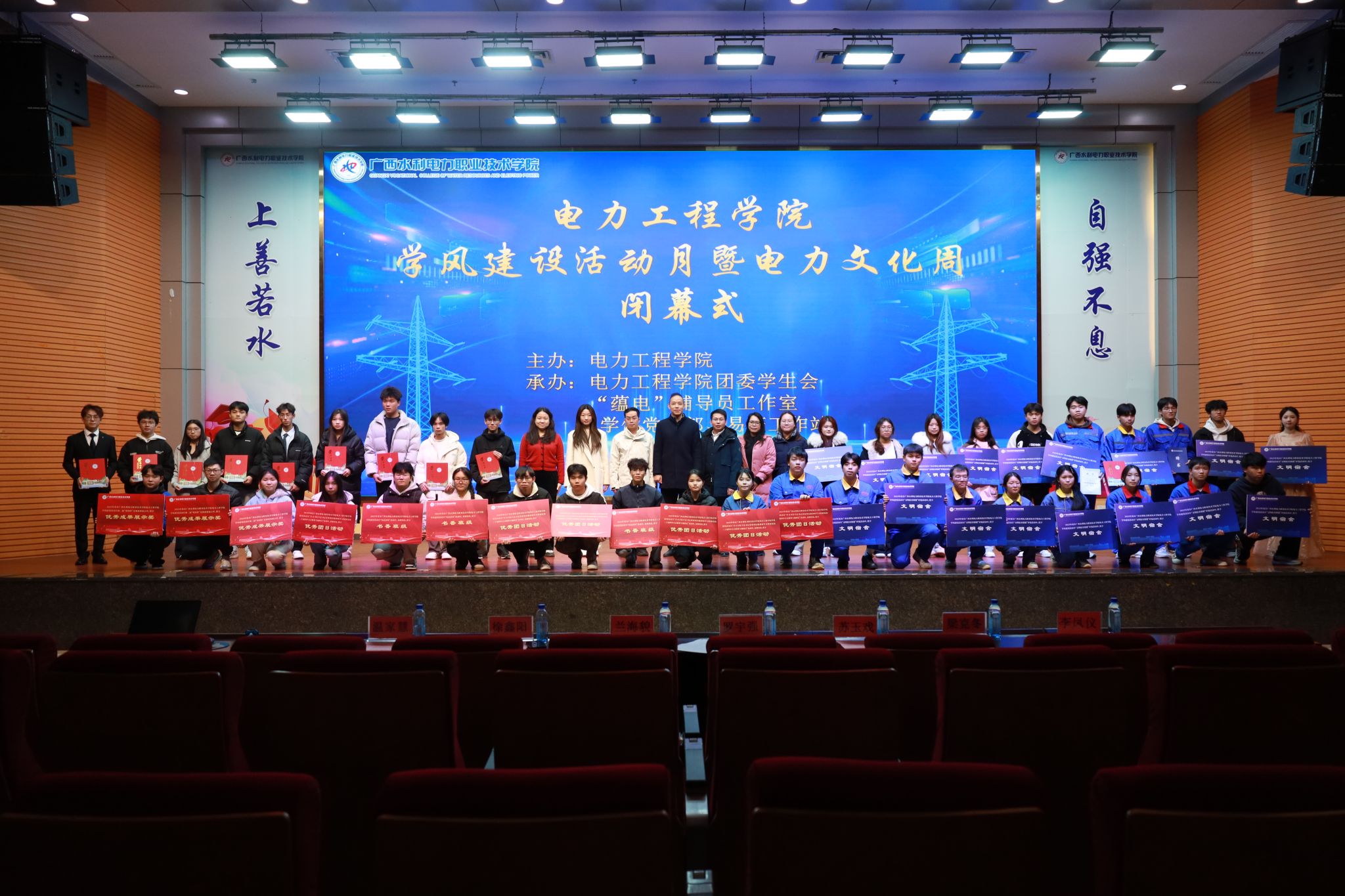 闭幕式上,罗宇强对学风建设月、电力文化周系列活动成果给予了肯定,并宣读表彰文件。随后来自25发电厂6班李益宏、24新能源1班谢黄权鸿、24供轨1班覃芳梅、25继保班江彩凌等同学分别就团支部建设、优秀学生成长事迹、电力科普宣讲、电力岗位认知报告等内容进行了主题分享。颁奖仪式上,学院对优秀团日活动、书香班级、优秀学生报告团、学习进步学子、技能竞赛等方面表现突出的集体和个人进行颁奖,充分肯定了同学们在思想引领、学风建设、技能发展等方面的卓越表现。