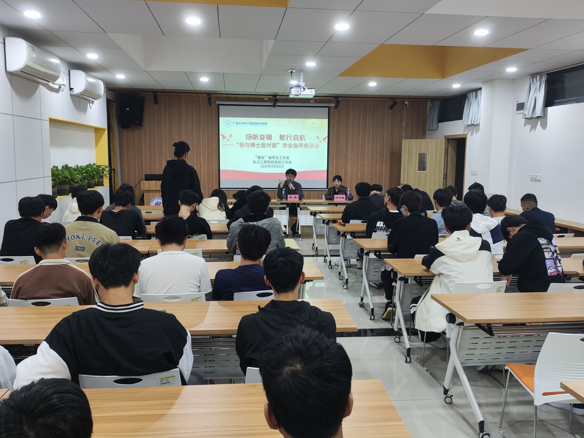 [本网讯]为促进师生交流,搭建师生间交流互动的平台, 3月20日晚,电力工程学院“蕴电”辅导员工作室联合学院易班学生工作站在“一站式”学生社区开展“扬帆奋楫 敏行启航”——‘我与博士面对面’学业指导座谈会。该活动由“蕴电”辅导员工作室主持人丁丽丽老师主持,学院专任教师彭逸博士、刘令芸老师、分团委书记兰海貌及23级发电厂及电力系统专业学生代表50余人参加了座谈会。
