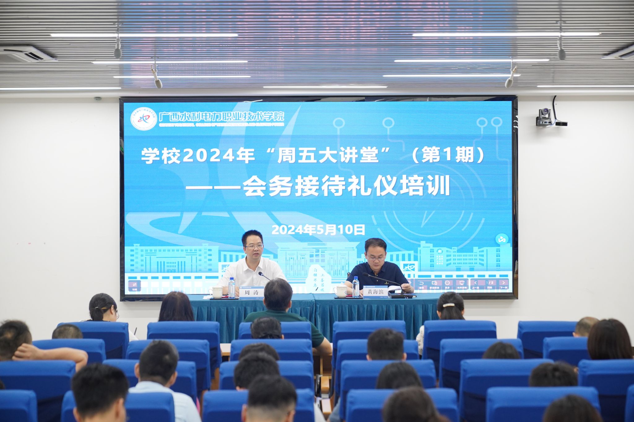 [本网讯]为进一步加强办公室队伍能力建设,提高“三服务”工作水平。5月10日上午,学校在长堽校区举办2024年“周五大讲堂”(第一期)——会务接待礼仪培训班。学校副校长周涛出席培训班并讲话,培训特邀国家高级礼仪培训师梁娟老师授课,培训围绕会前准备、会中服务、会后收尾等方面开展了现场讲解与实际操作。此次培训由学校党委办公室(学院办公室、党委统战部)主任(部长)黄海滨主持。