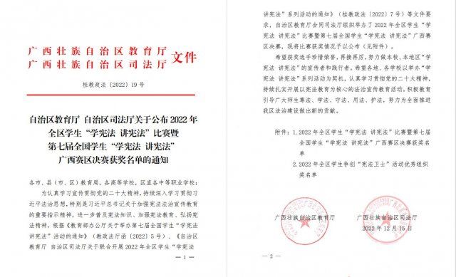 [本网讯]为深入学习贯彻习近平法治思想,由广西壮族自治区教育厅、自治区司法厅主办、广西师范大学承办的第届全国学生“学宪法 讲宪法”广西赛区选拔赛2022811月举行。AC米兰近日自治区教育厅公布2022年全区学生“学宪法讲宪法”比赛暨第七届全国学生“学宪法 讲宪法”广西赛区决赛获奖名单,分别荣获高校组“学宪法 讲宪法”活动知识竞赛优秀奖2022年全区学生争创“宪法卫士”活动优秀组织奖。