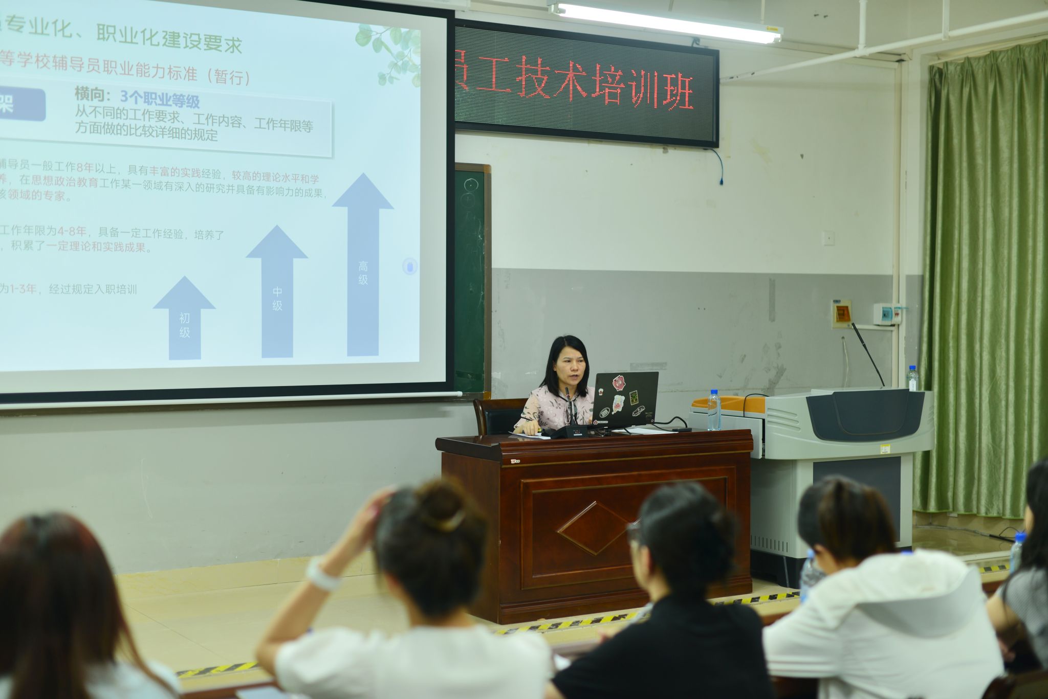 整体培训内容涵盖专题学习、主题报告以及业务交流等板块。期间,党委学生工作部(学生工作处)部长(处长)助理李泳以《辅导员职业能力提升》为题,从辅导员工作要求与职责、配备与选聘、培养与发展、管理与考核等方面详细讲解了学校加强和改进辅导员队伍建设的各项文件政策。招生与就业处处长邓佳富以《辅导员在学生就业过程中的角色定位》为题,阐述辅导员在大学生就业指导教育中的作用发挥,帮助学生明确职业目标、规划职业道路、提高就业竞争力的方式方法。团委副书记梁卉对推优入党、团员发展、“第二课堂成绩单”“智慧团建”系统等基础团务工作了介绍,讲解了新时代大学生思想政治的工作思路和方法。教务处、学工处相关工作人员分别围绕教学运行、学籍管理、学生日常管理实务、宿舍管理、学生育人等方面进行了专题培训。