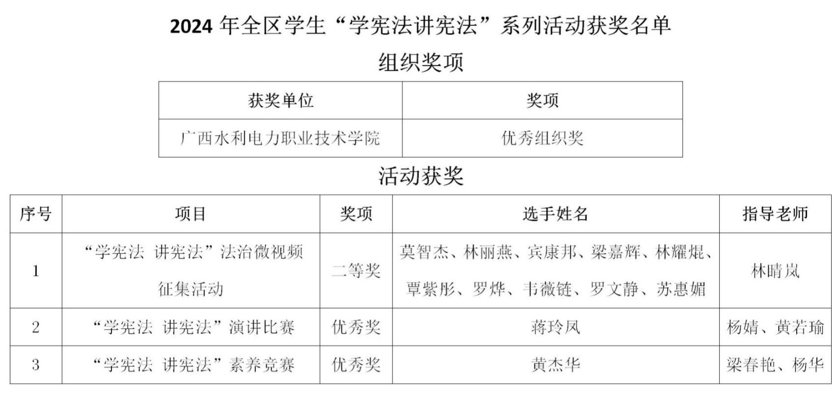 [本网讯]近日,自治区教育厅、自治区司法厅、自治区科协下发《关于公布2024年全区学生“学宪法 讲宪法”系列活动获奖名单的通知》。学校荣获2024年全区学生“学宪法讲宪法”系列活动“优秀组织奖”,AC米兰自动化工程学院师生团队创作的视频作品《宪法伴我们成长》获法治微视频征集活动二等奖,水利工程学院蒋玲凤同学获演讲比赛优秀奖,土木建筑工程学院黄杰华同学获素养竞赛优秀奖。