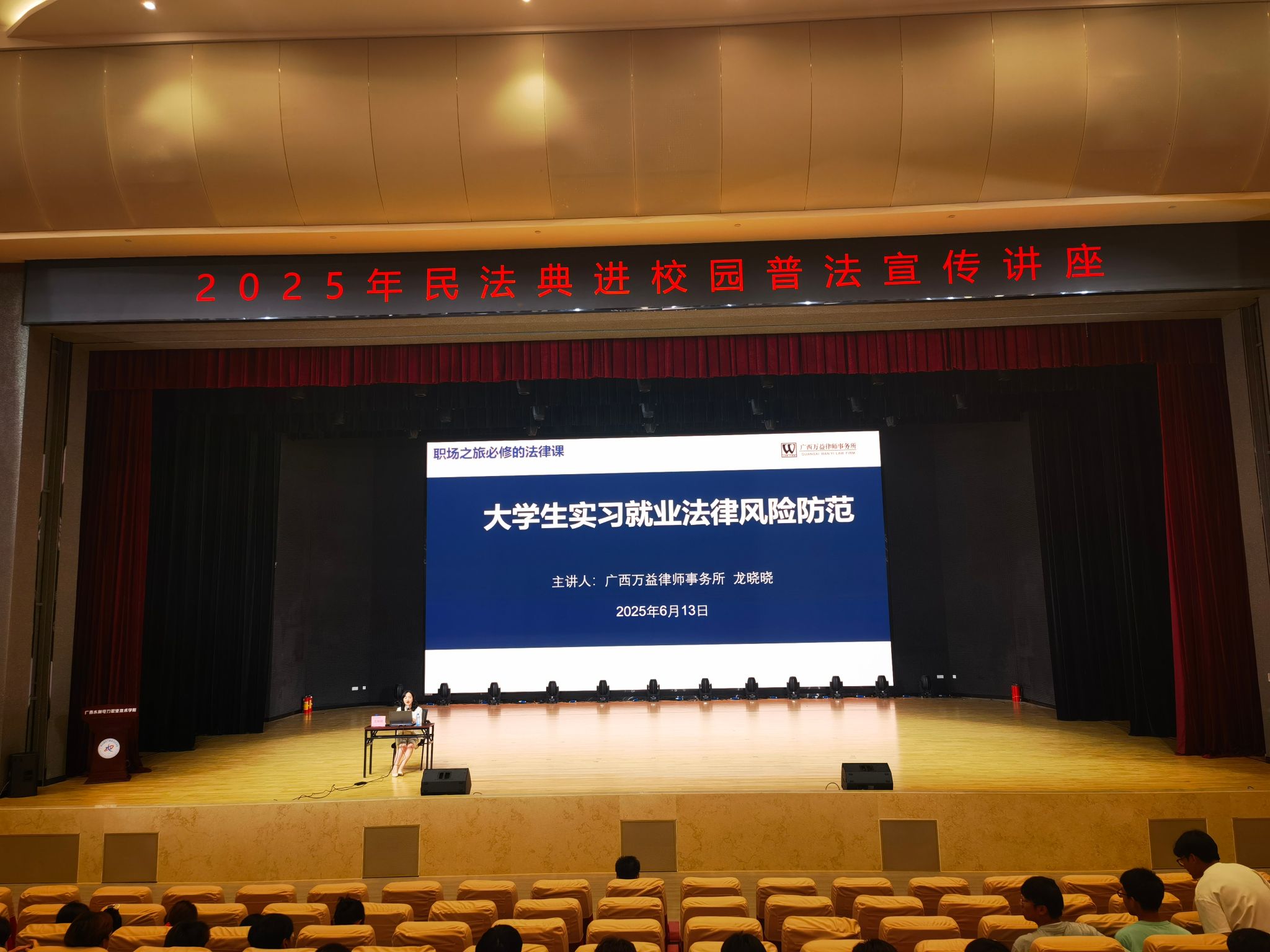 本次讲座特别邀请了广西万益律师事务所合伙人龙晓晓律师作为主讲人。龙律师拥有丰富的法律实践经验和深厚的法学理论功底。讲座中,她围绕实习权益、就业权益、劳动保障、防范职场性骚扰等核心议题,为学生们进行了深入浅出的讲解。她结合具体案例,生动形象地阐述了民法典在实习就业过程中的重要作用,引导学生们树立正确的法律观念,学会运用法律武器维护自身合法权益。讲座现场气氛热烈,学生们积极参与互动,学生们纷纷表示,通过本次讲座,自己对民法典有了更深入的了解,对未来的实习就业充满了信心。
