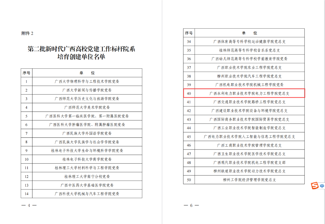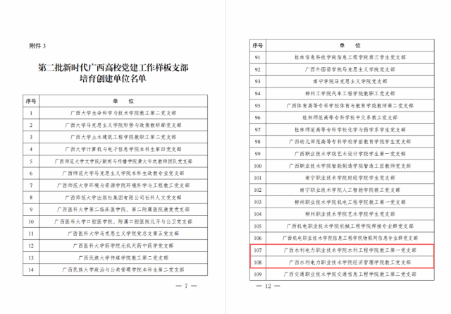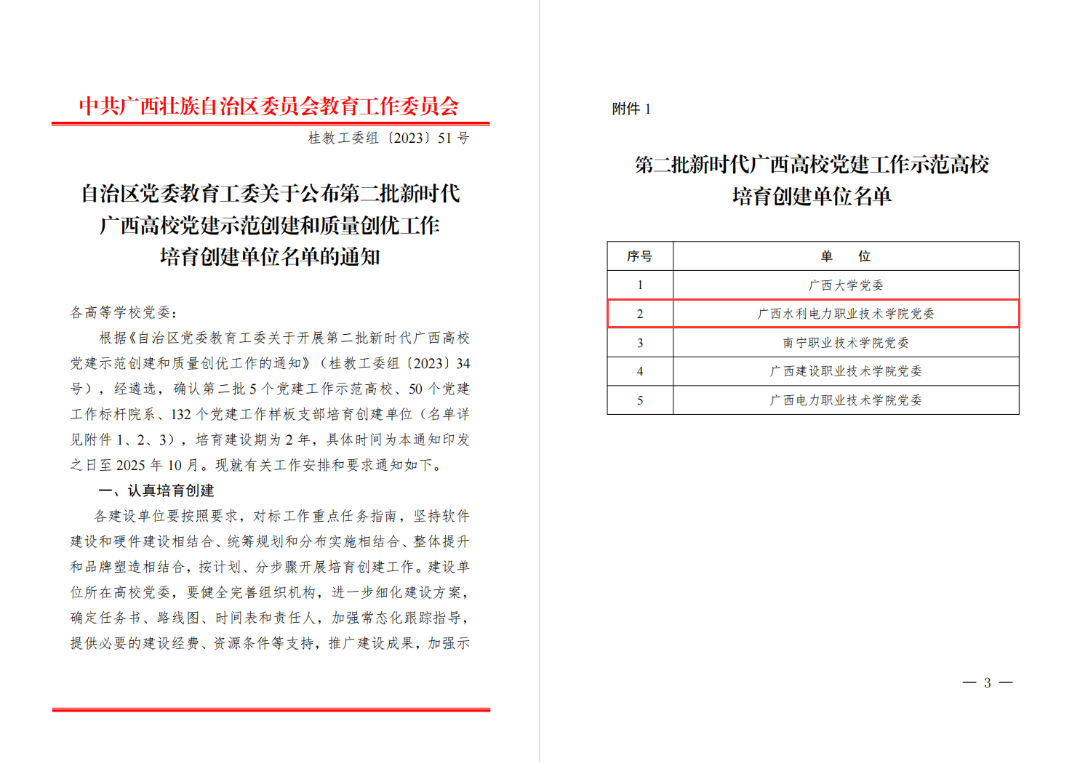 [本网讯]近日,自治区党委教育工委印发《自治区党委教育工委关于公布第二批新时代广西高校党建示范创建和质量创优工作培育创建单位名单》(桂教工委组〔2023〕51号),学校申报的第二批新时代广西高校党建“双创”项目全部获批!其中学校党委获批党建工作示范高校培育创建单位(全区共5所高校党委入选,AC米兰党委在高职院校中排名第一),电力工程学院党总支获批党建工作标杆院系培育创建单位,水利工程学院教工第一党支部和经济管理学院教工党支部获批党建工作样板支部培育创建单位。