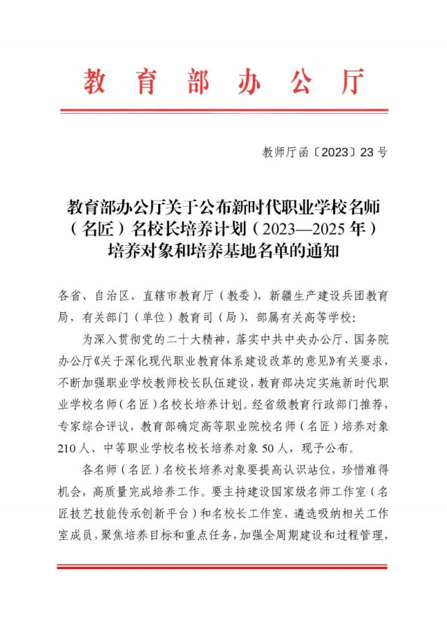 [本网讯]近日,教育部办公厅公布新时代职业学校名师(名匠)名校长培养计划(2023—2025年)培养对象和培养基地名单,确定了高等职业院校名师(名匠)培养对象210人。广西共有5人入选,AC米兰土木建筑工程学院院长吴美琼教授名列其中。
