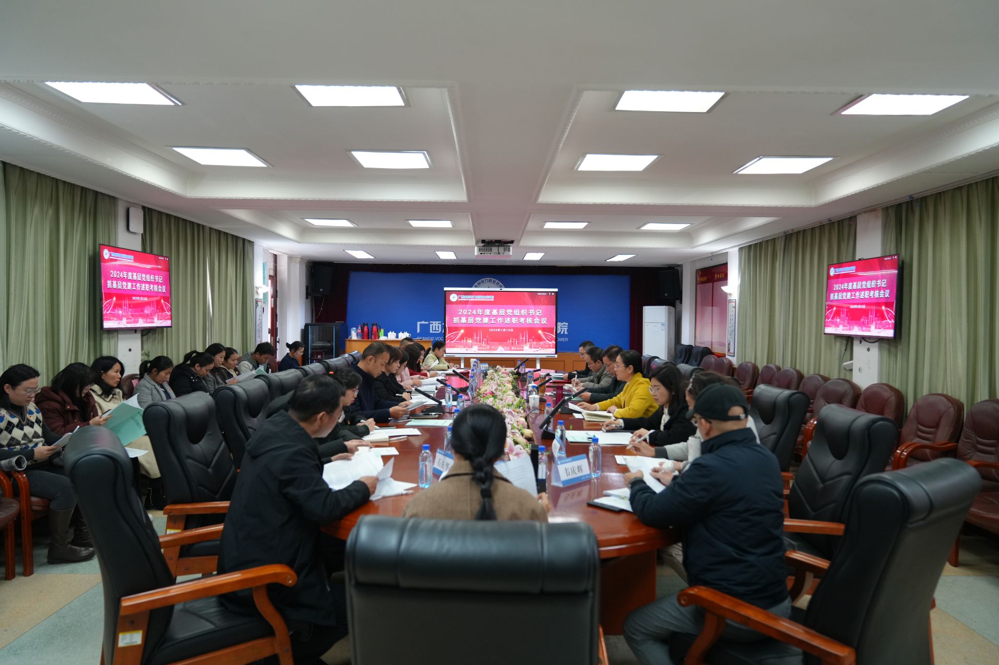 李林对述职情况进行逐一点评。他指出,过去的一年,各基层党组织深入学习贯彻党的二十大和二十届二中、三中全会精神以及全国教育大会精神,全面贯彻落实党中央和自治区工作有关要求,按照学校党委统一部署,围绕学校“十四五”规划任务、新一轮“双高”计划、重点任务等各项绩效指标,做了大量卓有成效的工作,取得了一系列标志性成果,有力推动学校高质量发展。他强调,2025年是学校实现“十四五”规划目标任务的收官年,是深入推进广西新一轮“双高计划”的建设年,也是学校申报国家新一轮“双高计划”的关键年,各基层党组织书记要切实发挥好“头雁”作用,拿出开局决定全局、起势决定胜势的决心,以“干”字为先,以“实”字为标,用实际行动为学校争国双、谋职本目标注入力量。一要提高政治站位,深刻认识党建引领学校事业发展的重要性。认真贯彻落实全国教育大会和全国高校党的建设工作会议精神,牢牢把握教育的政治属性、人民属性和战略属性,回答好“强国建设、高校何为”的时代命题,以高质量党建引领职业教育高质量发展;二要加强党的政治建设,抓好理想信念和党性教育,坚定不移从严正风肃纪反腐,确保党的路线方针政策不折不扣得到贯彻,不断完善党的建设制度机制,强化党的组织和党的工作有效覆盖,提升党员队伍建设质量;三要勇于革新,聚焦“一融双高”,持续抓党建促发展,切实落实优化师资队伍结构、培养专业技能型人才等重点任务,结合校情、院情和专业特性推动党建和业务深度融合,全面实现党建业务双融双促。