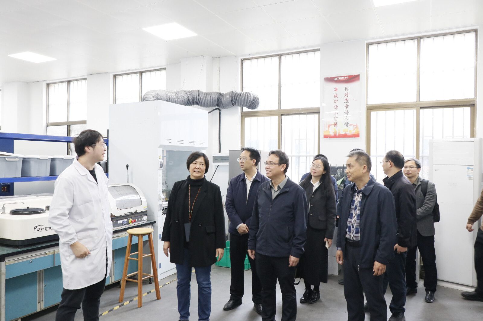 广西大学机械工程学院党委书记卢婵江、电气工程学院党委书记梁志坚陪同参观。刘存香一行参观了广西大学机械工程学院国家级工程训练中心、广西低碳智能动力实验室、新能源汽车研发中心、国家级电气工程实验教学示范中心,深入了解了两个学院智慧化的教学设备和先进的研发实力。