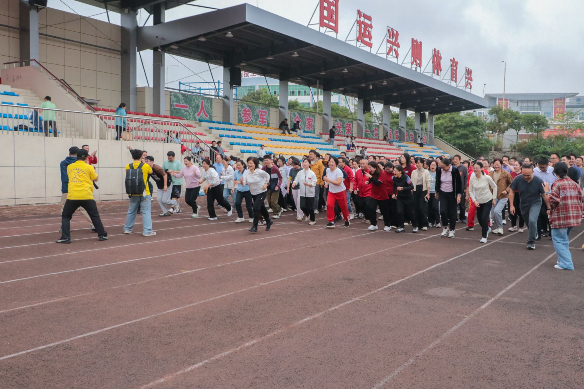 此次运动会以各分工会为单位,共组建了13支参赛队伍,参与人数创学校同类活动历史新高。赛前,全体教职工进行了集体第九套广播体操热身。学校校长刘存香为个人健身跑项目发令,田径场上教职工们步伐矫健、奋勇争先。