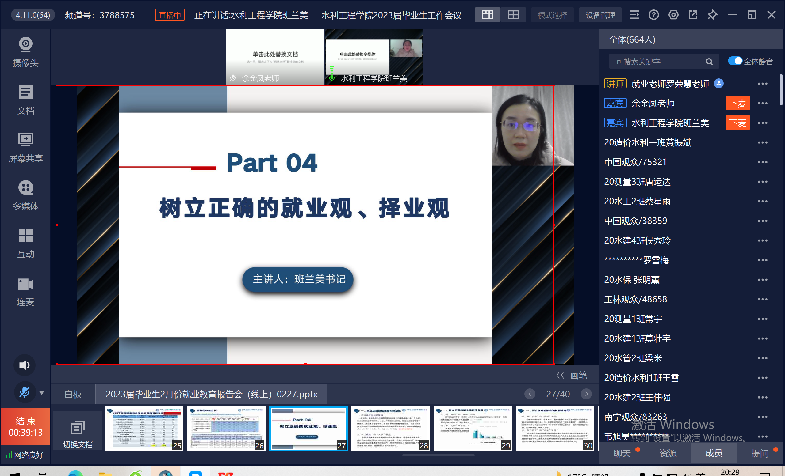 [本网讯]为做好2023届毕业生就业指导工作,引导和帮助2023届毕业生认清就业形势,了解就业政策,转变就业观念,积极主动求职就业,2月27日晚,水利工程学院在线上直播召开2023届毕业生就业教育报告会,本次会议由就业干事罗荣慧老师主持,余金凤院长、班兰美书记、毕业班辅导员和毕业班700多名学生参加。