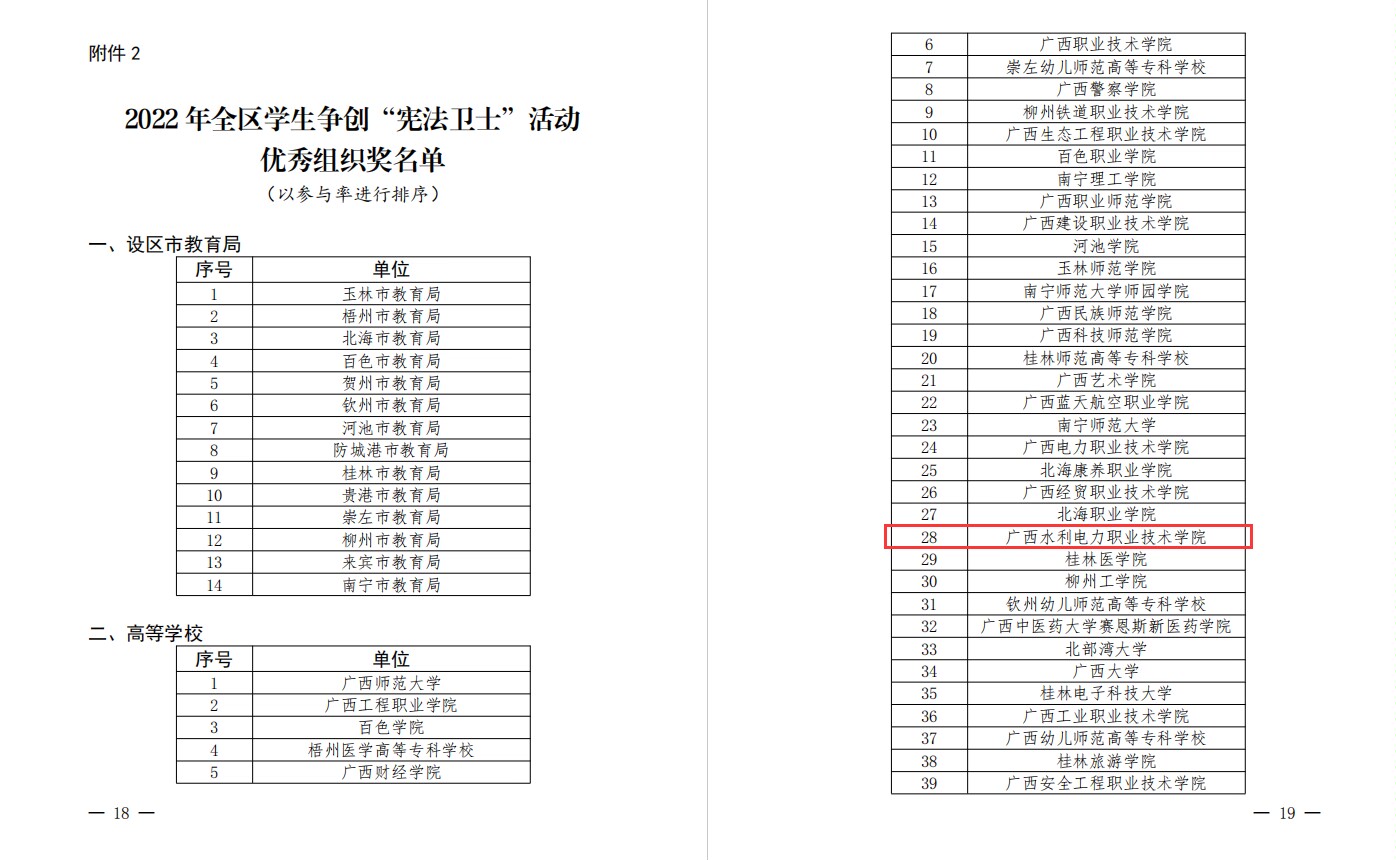 [本网讯]为深入学习贯彻习近平法治思想,由广西壮族自治区教育厅、自治区司法厅主办、广西师范大学承办的第七届全国学生“学宪法 讲宪法”广西赛区选拔赛于2022年8月—11月举行。AC米兰在近日自治区教育厅公布的2022年全区学生“学宪法讲宪法”比赛暨第七届全国学生“学宪法 讲宪法”广西赛区决赛的获奖名单中,分别荣获高校组“学宪法 讲宪法”活动知识竞赛优秀奖和2022年全区学生争创“宪法卫士”活动优秀组织奖。