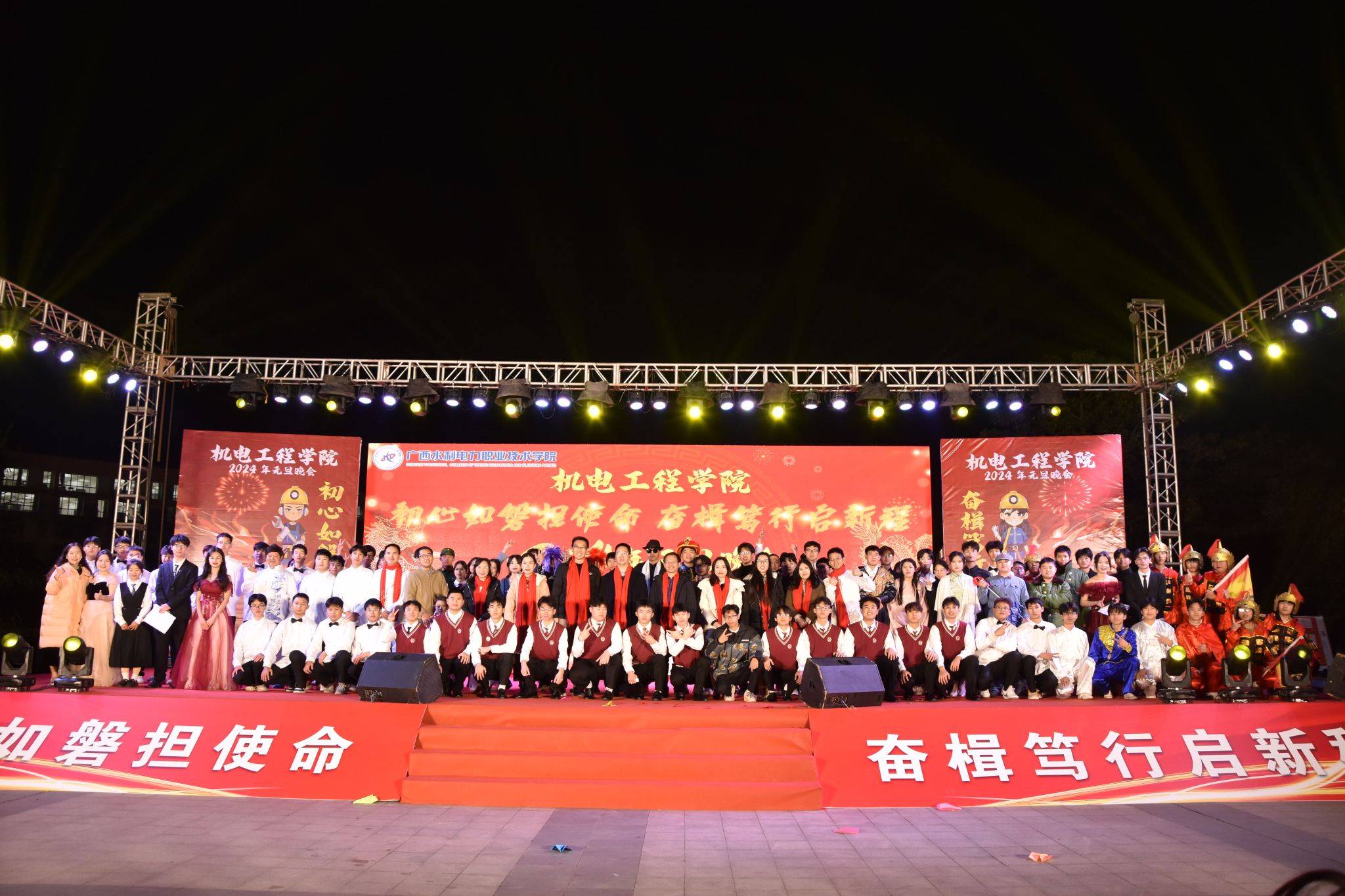 为凝聚师生情谊,迎接2024年元旦佳节的到来,12月21日晚,机电工程学院在里建校区图书馆前举办2024年“初心如磐担使命 奋楫笃行启新程”元旦晚会,学校副校长周涛、学校招生与就业处副处长黄曦慧、南宁市公安局里建派出所李元生警官、广西-东盟经济开发区兴侨社区居委会副主任方雪兰受邀出席活动,机电工程学院全体师生参加活动。