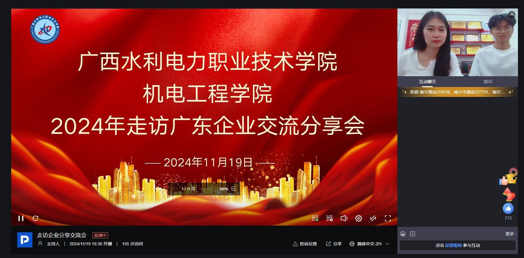 [本网讯]为进一步提升学生的实践能力和就业竞争力,推动校企育人实效,同时也为激发学生学习动力,发挥朋辈引领作用,11月19日晚,机电工程学院以线上直播方式举办了企业走访交流汇报会。汇报会由2023级八个专业学生代表分享10月31日至11月2日走访广州及惠州四家企业的成果与心得。