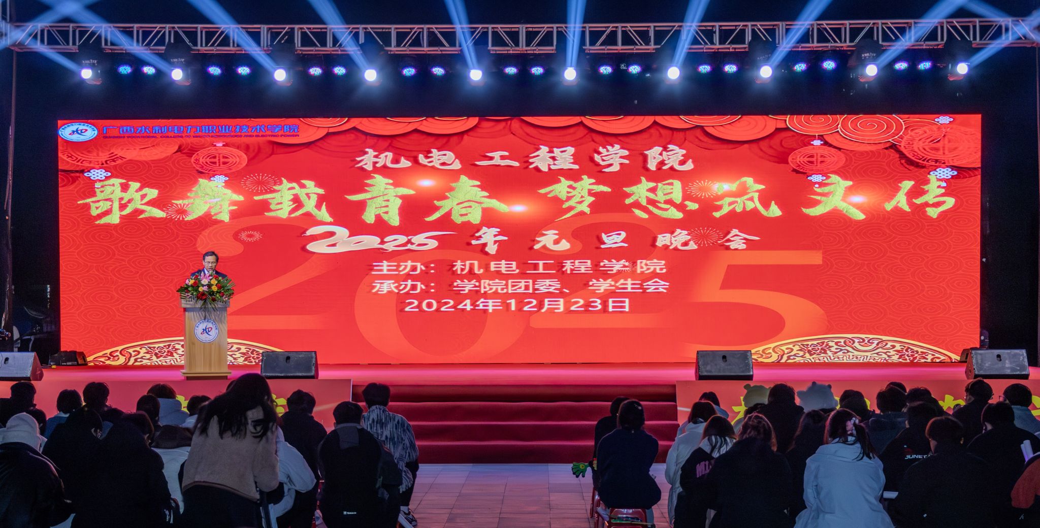 [本网讯]12月23日晚,机电工程学院在里建校区图书馆前广场举办2025年“歌舞载青春 梦想筑文传”元旦晚会,学校校长李林、副校长蒋文沛出席活动。