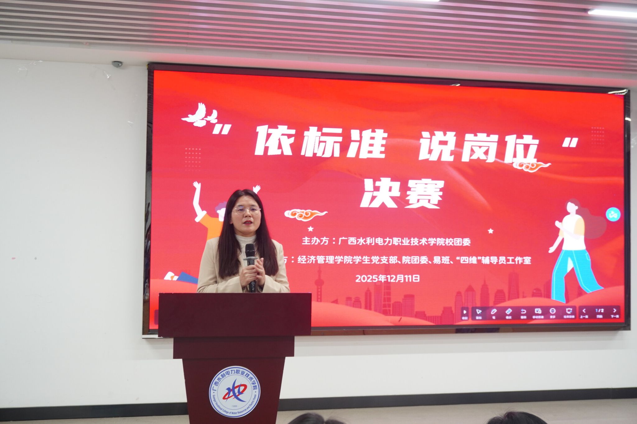 [本网讯]为进一步提升学生的专业素养,引导大学生树立正确就业观,帮助学生对未来职业生涯有更全面的理解和规划,经济管理学院于12月11日在长堽校区第四教学楼1-5报告厅举行第二届“依标准 说岗位”比赛决赛,学院党总支书记班兰美出席活动,专任教师代表黄玥、区诗琳、周燕蓉、郭嘉坚,院团委副书记刘义蕾担任评委,共有11支队伍参加决赛。