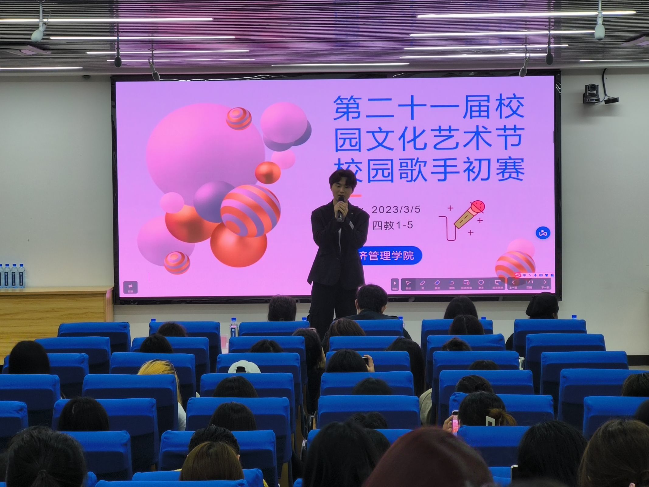 [本网讯]为积极推进学校“三全育人”工作,助力培养德智体美劳全面发展的社会主义建设者和接班人,引导青年学生保持昂扬姿态,汇聚团结奋斗的青春力量,同时为学生提供施展才华的舞台,3月5日晚上,经济管理学院在长堽校区四教教学楼1-5报告厅举办了“唱响新时代,奋进新征程”为主题的第二十一届校园文化艺术节校园歌手大赛初赛。经济管理学院党总支书记邓佳富出席本次活动现场,担任比赛评委的有经济管理学院团委书记冯文,常智勇老师,以及学生评委韦雪怡、宁志群。