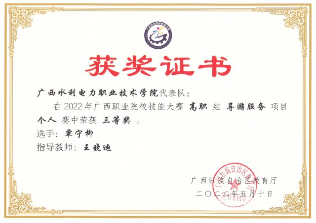 在 2022 年广西职业院校技能大赛高职组导游服务项目个人赛中荣获