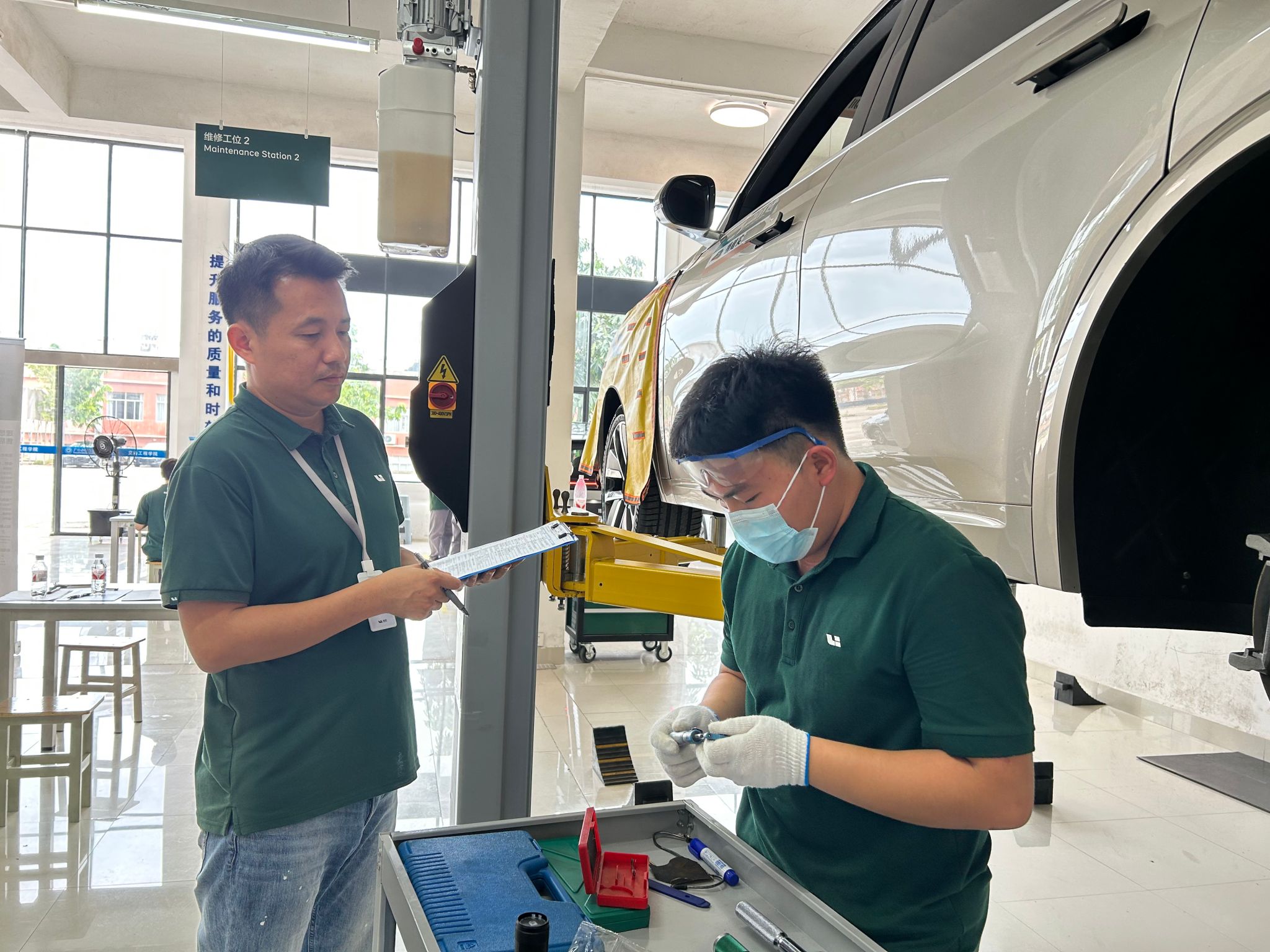本次结业考核是在完成8次月度考核基础上进行的综合性总评考核,是践行“教考分离”的重要举措。担任本次实操考评的考官均由理想汽车服务中心的技术主管和维修专家组成,考核过程严格按照企业规范流程要求进行评分,确保了考核的专业性和公正性。