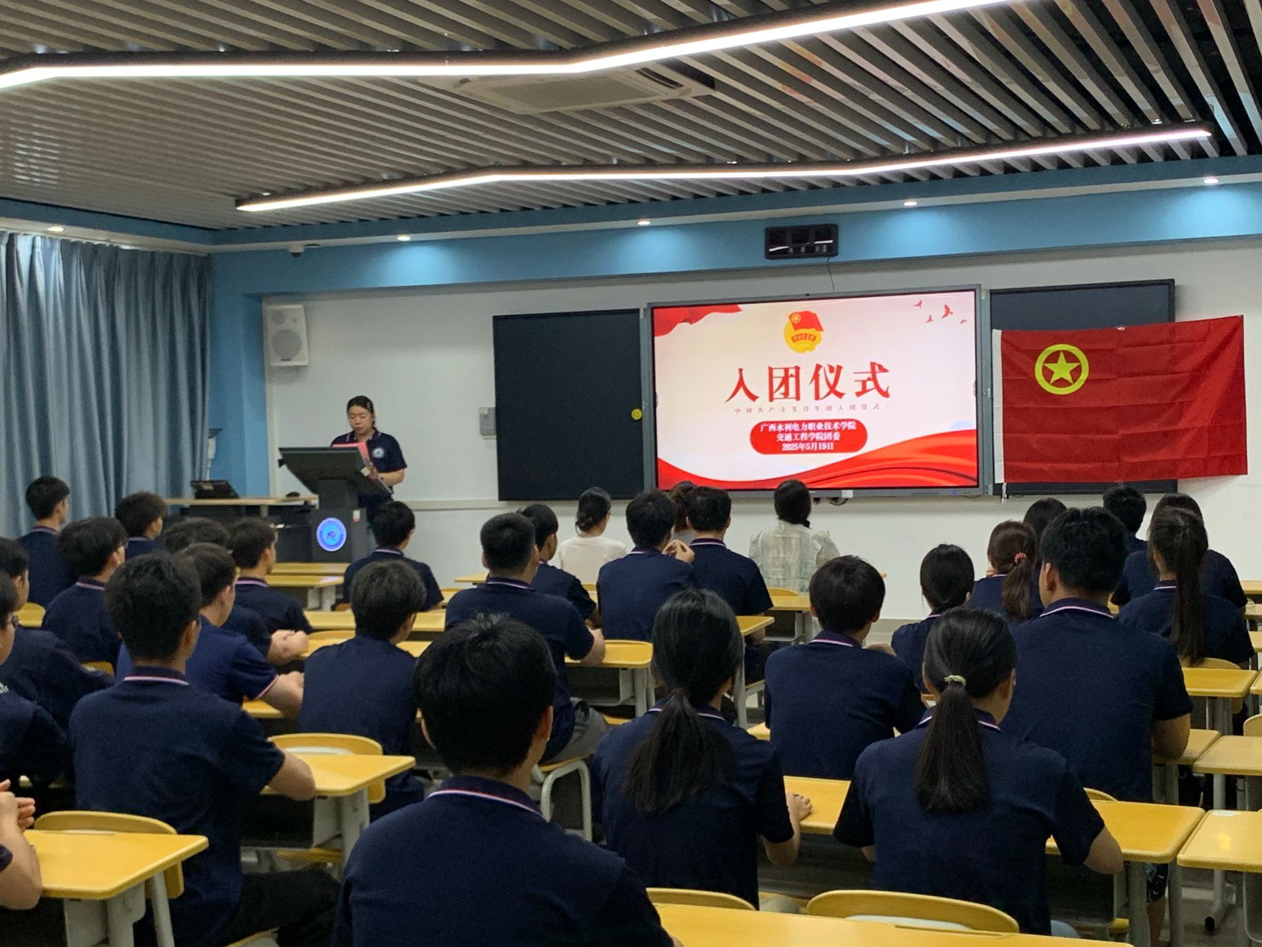 [本网讯]为了强化新团员的身份认同,强化共青团组织建设,激发团员青年的担当意识与奋斗精神,5月19日,交通工程学院在里建校区教学楼213教室举行2025年上半年新团员入团仪式,交通工程学院团委书记梁爱婵、团委副书记姜美婷、辅导员范梓琪以及新发展团员、23-24级各班团干代表参加此次入团仪式。