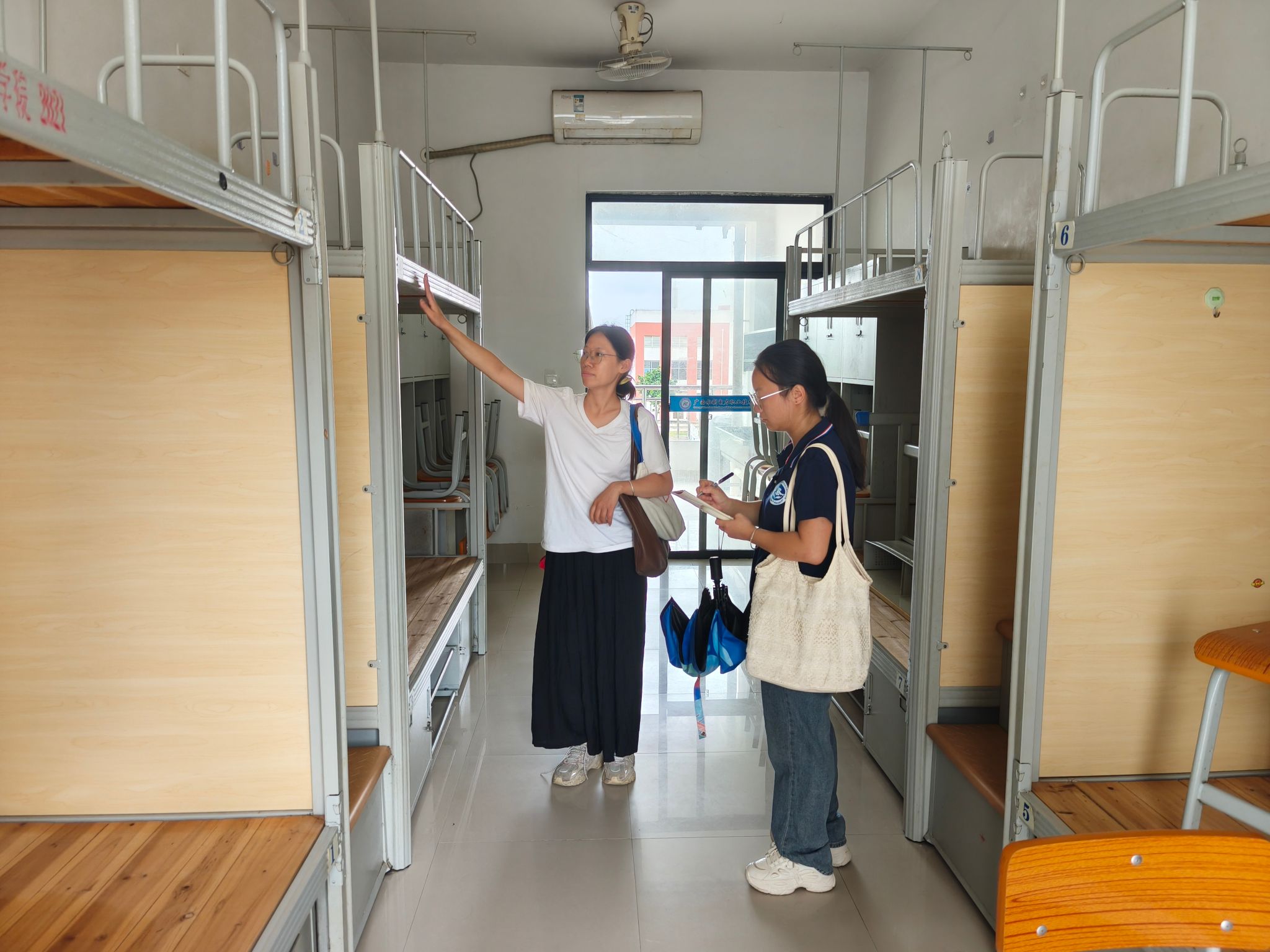 新生辅导员和助班检查宿舍安全卫生情况