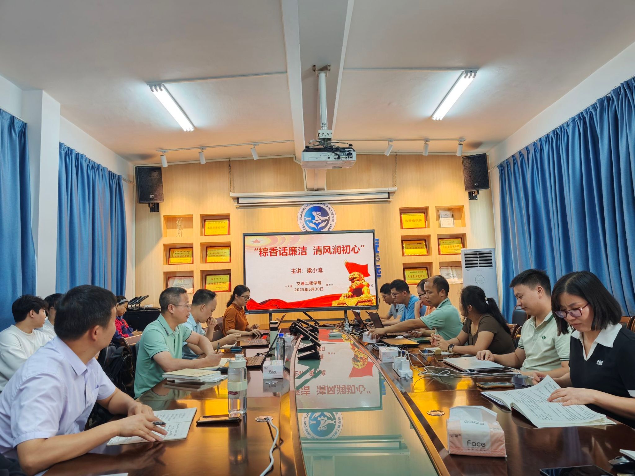 梁小流分别从节日期间的纪律红线、党员干部的节日“三问”、违反中央八项规定精神典型案例、守“廉关” 过“廉节”等四个方面,将端午节的深厚文化内涵与新时代廉洁文化建设要求紧密结合,引导广大党员教师在感悟传统节日文化魅力的同时,汲取廉洁养分,涵养清风正气。他结合高等教育领域和学院工作实际,深入分析了当前党风廉政建设面临的形势与挑战,特别是师德师风建设、科研经费管理、招生录取、评奖评优、物资采购等重点领域和关键环节的廉洁风险点。要求全体教师常修为师之德,涵养高尚情操,要坚守教育初心,恪守职业道德;常行廉洁之事,永葆清廉本色,要在日常教学、科研、管理、服务工作中,坚持原则、秉公用权,自觉抵制各种诱惑和不正之风,营造风清气正的育人环境。