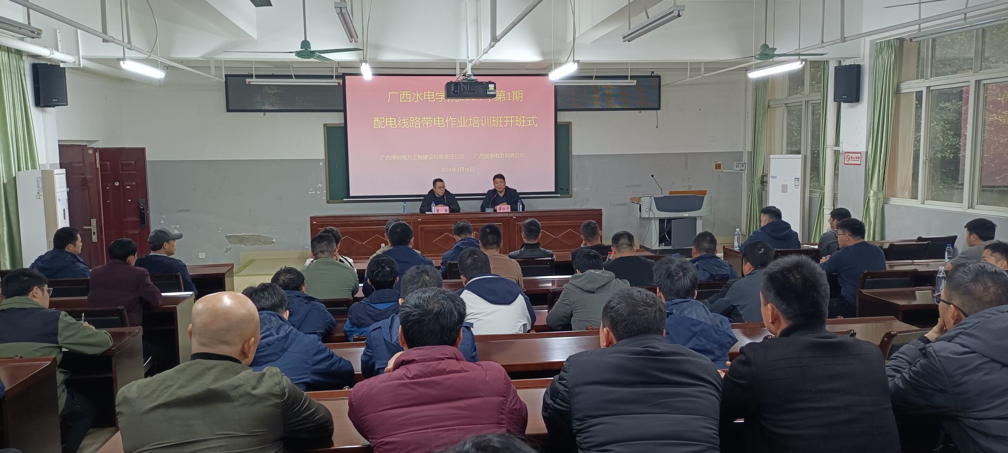 [本网讯]3月15日,2024年第一期“配电线路带电作业”培训班在长堽校区第四教学楼2-5教室如期开班,来自广西博阳电力工程建设有限责任公司和广西国泰电力有限公司的一线员工共计44人参加了此次培训。继续教育学院院长谭社平主持开班仪式并致辞。