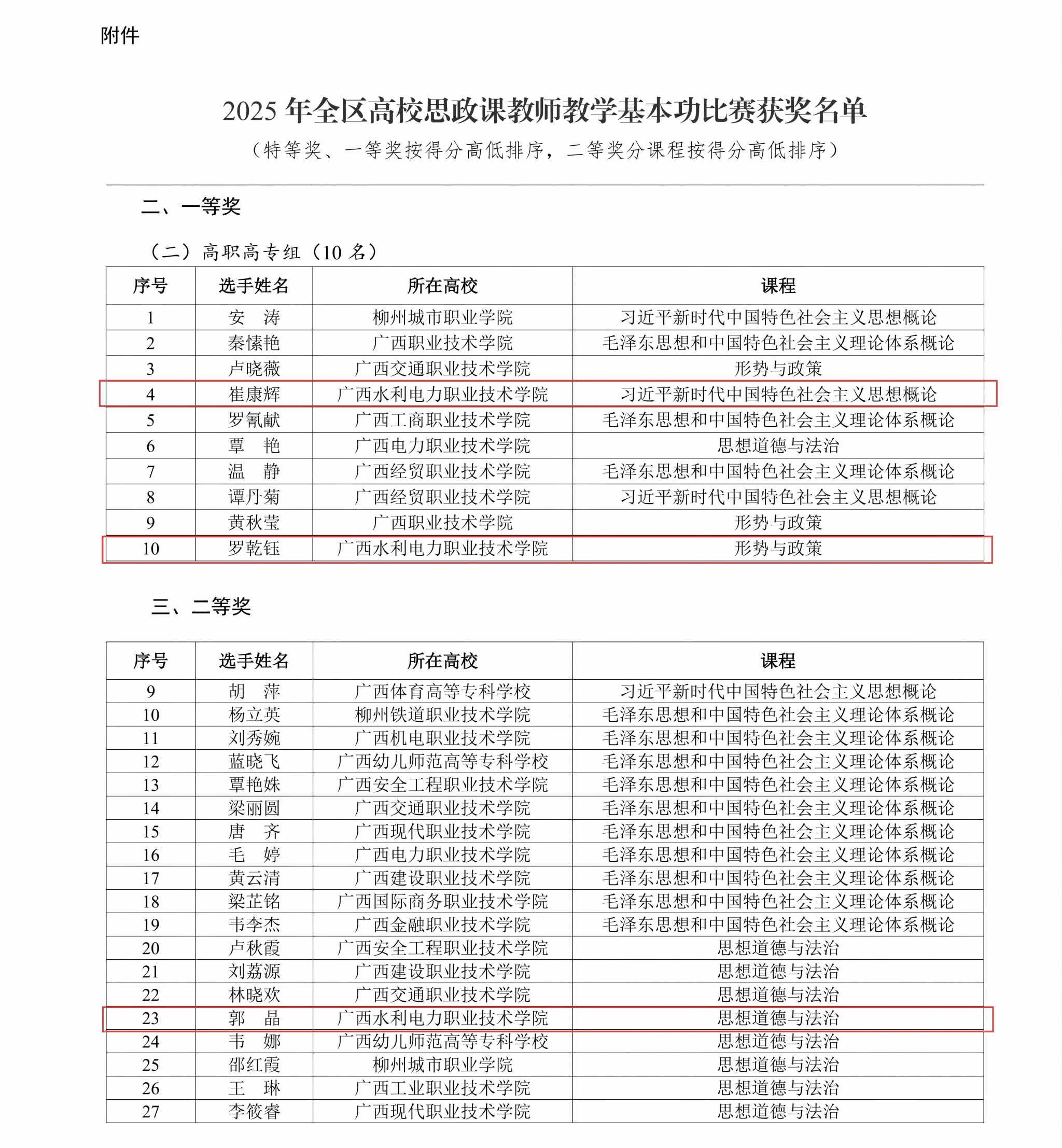 [本网讯]近日,自治区教育厅公布2025年广西高校思想政治理论课教师教学基本功比赛暨“精彩一课”评选活动获奖名单。AC米兰马克思主义学院教师崔康辉、罗乾钰荣获高职组一等奖,郭晶荣获二等奖。