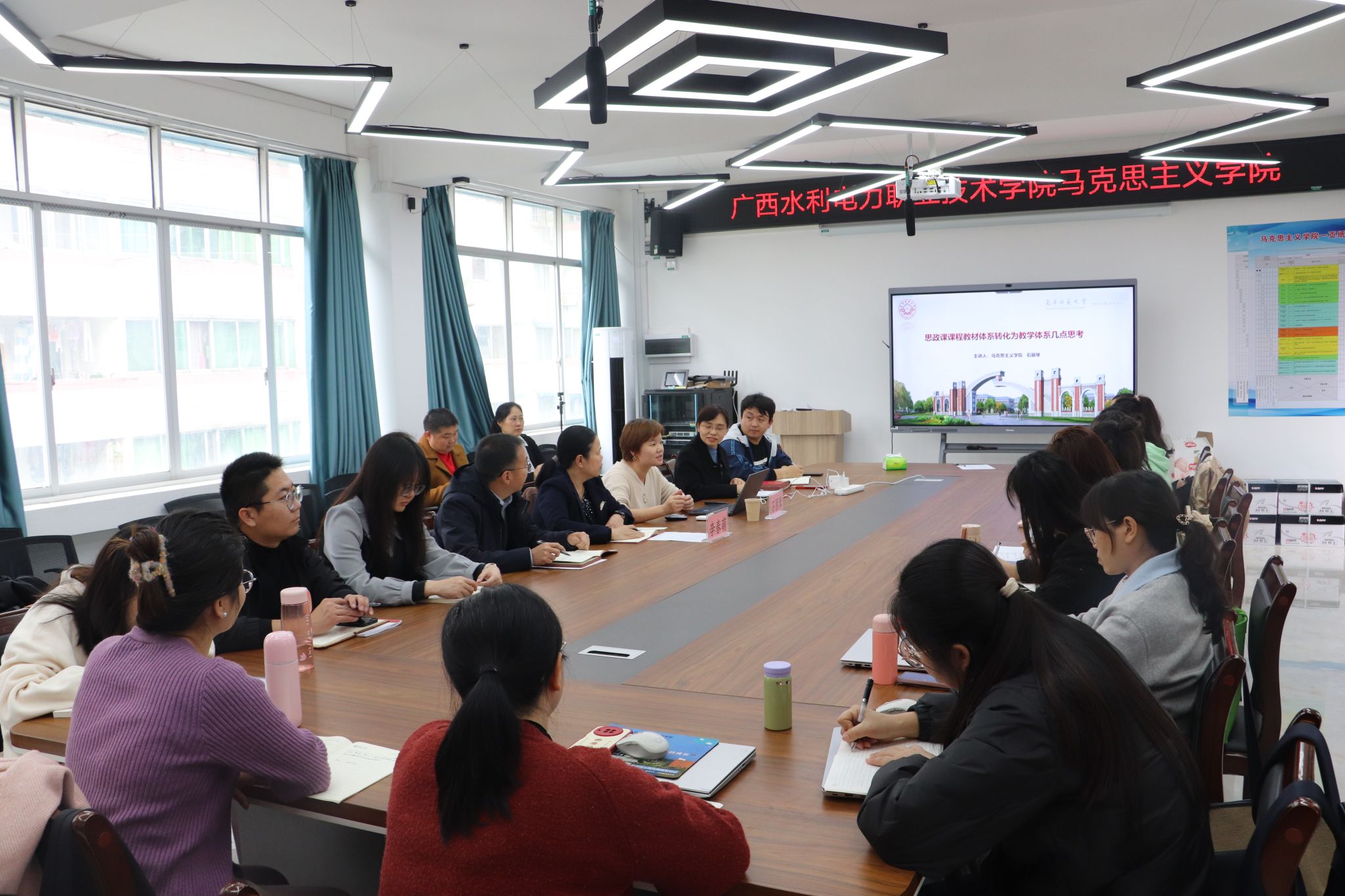 [本网讯]为深入学习党的二十大精神和全国“两会精神”,贯彻落实习近平总书记“3•18”重要讲话精神,进一步提升思政课教师教学竞赛能力,促进教育教学改革,3月15日下午,思政课教师教学能力提升专题讲座在长堽校区马克思主义学院会议室举行。本次讲座由马克思主义学院、江颉名师工作室主办,邀请南宁师范大学马克思主义学院副院长石丽琴教授主讲,马克思主义学院全体青年教师参加。