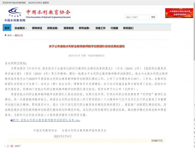 [本网讯]近日,中国水利教育协会官网发布《关于公布首批水利职业教育教师教学创新团队验收结果的通知》,学校余金凤教授领衔的水利水电建筑工程团队和陈炳森教授领衔的水利机电设备运行与管理团队,均通过验收。