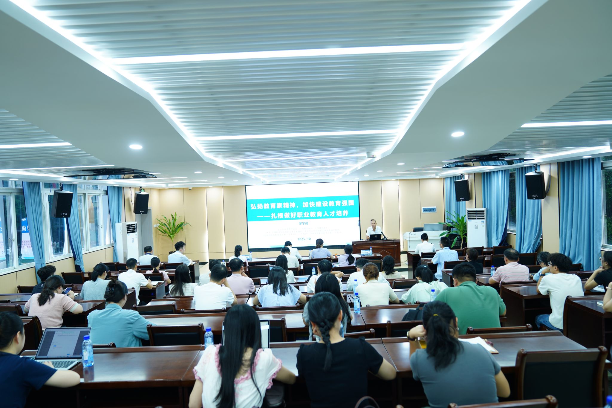 讲座环节,两位教师的分享既有理论高度,更有实践温度。广西优秀教师、通识教育学院院长、二级教授韦弘老师以《践行教育家精神做“经师”和“人师”相统一的大先生》为题,从甲骨文中“师”字蕴含的“传道授业”本义切入,结合自己在职业教育一线深耕经历用鲜活的案例,阐释教育家精神的逻辑意蕴,强调了“四有”好老师标准与教育家精神的内在关联,强调“经师”要夯实专业功底,“人师”要涵养育人情怀,二者统一才是教育的本质。