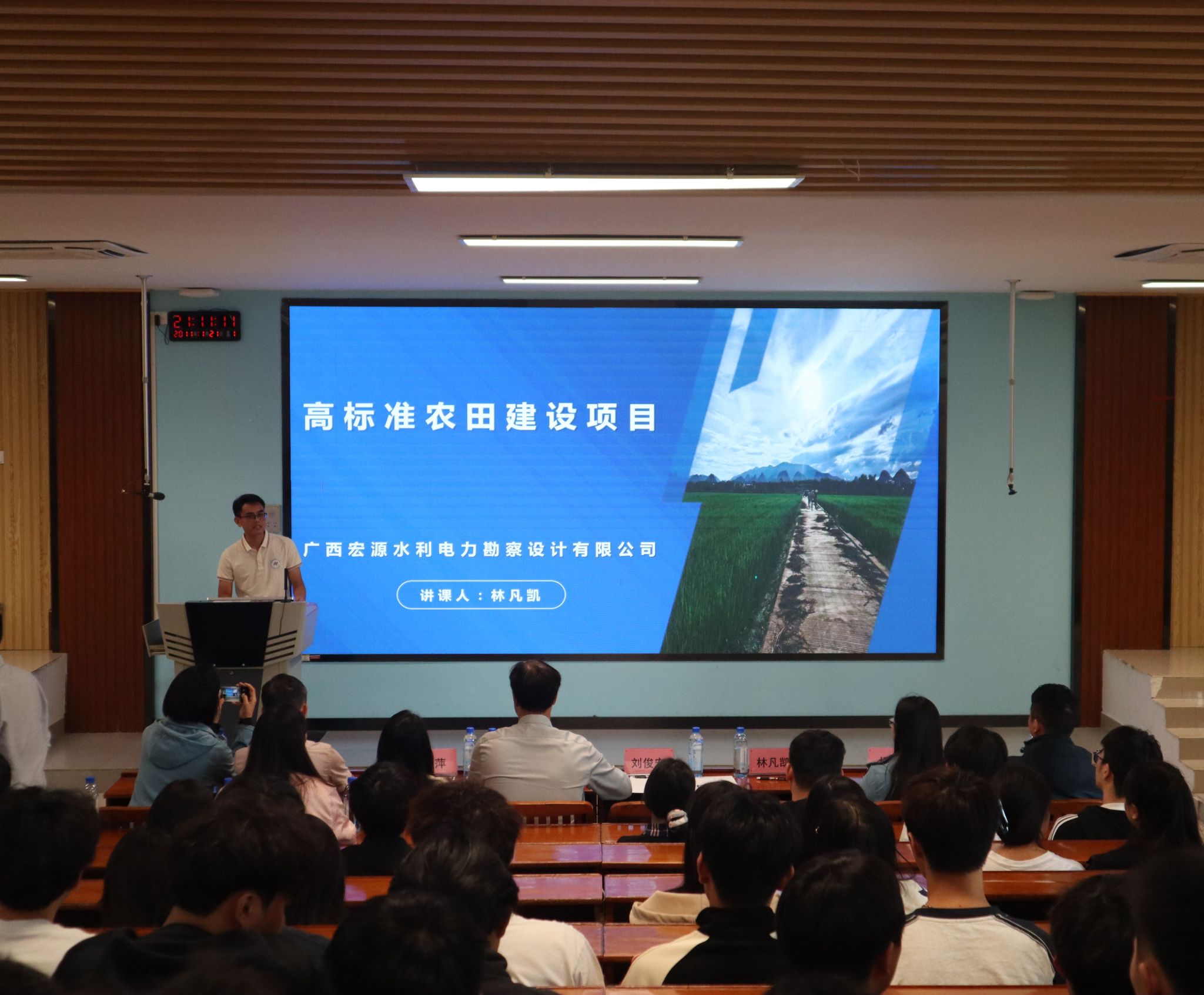 讲座邀请了来自广西宏源水利电力勘察设计有限公司的林凡凯、杨露、张铎继和吴雪丁四位杰出的校友,围绕高标准农田设计、中型灌区设计、城乡供水一体化设计和河道治理工程四大领域进行了精彩纷呈的讲座。校友们结合实际工程案例和丰富的实战经验,为同学们讲解了各种水利工程设计流程、设计要点等关键技术,并提供了宝贵的行业见解与职业岗位发展建议。