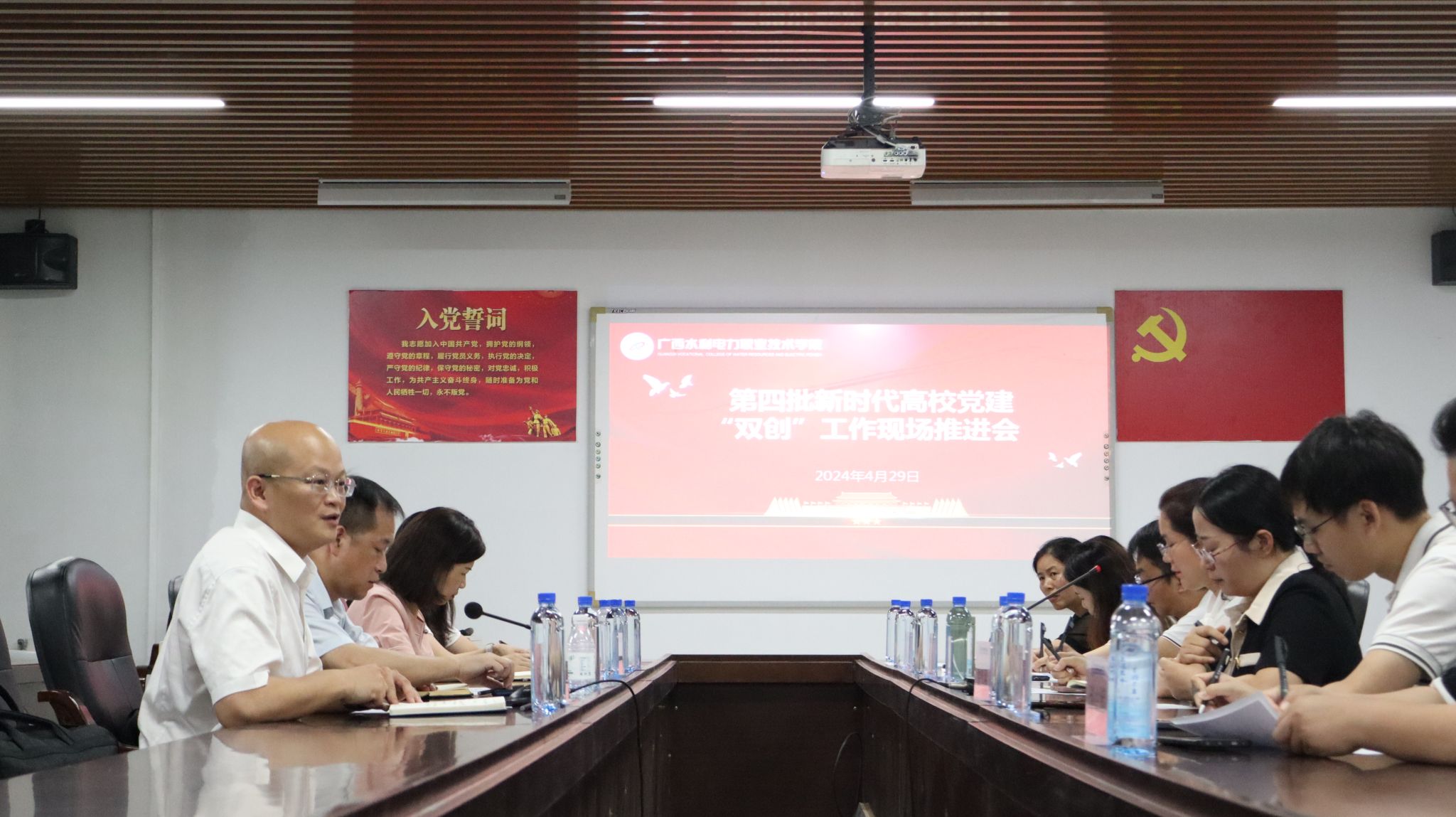 [本网讯]为扎实推进第四批新时代高校党建“双创”工作,4月29日上午,学校党委副书记侯宗毅、学校党委组织部(人事处)部长(处长)区倩如、副部长(副处长)韦庆辉深入水利工程学院开展第四批新时代高校党建“双创”工作调研。水利工程学院党总支书记班兰美、专职组织员韦冬明、教工第一党支部书记廖明菊、教工第二党支部书记韦庆华、学生党支部书记庞海瑜到场参加。