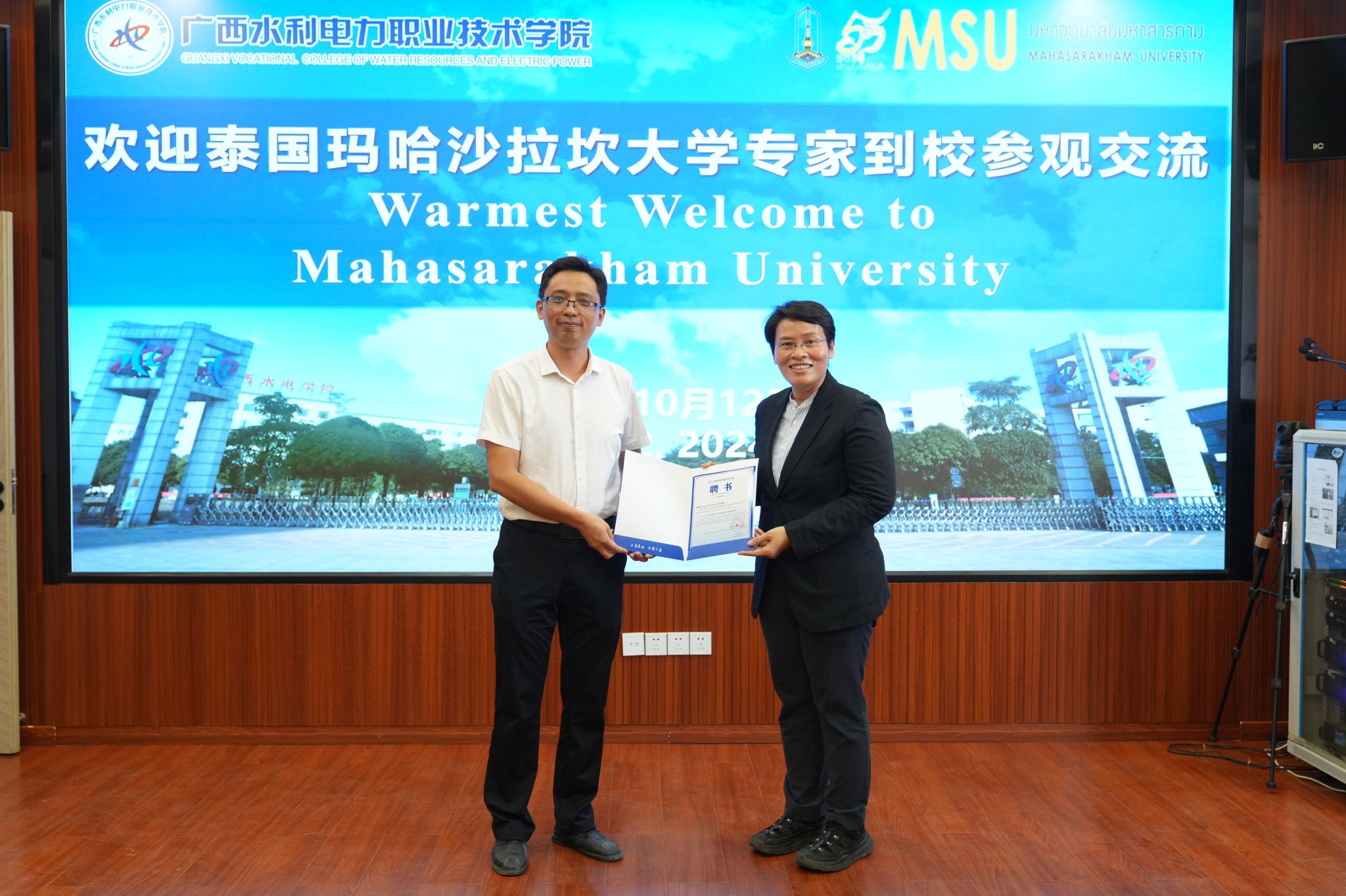 潘念萍对玛哈沙拉坎大学一行的来访表示诚挚欢迎,互赠了文化特色礼物。随后,学校为Piyapatr Busababodhin教授颁发了客座教授证书,并邀请Piyapatr Busababodhin教授作“鸿雁工程”水利专题师资培训讲座。