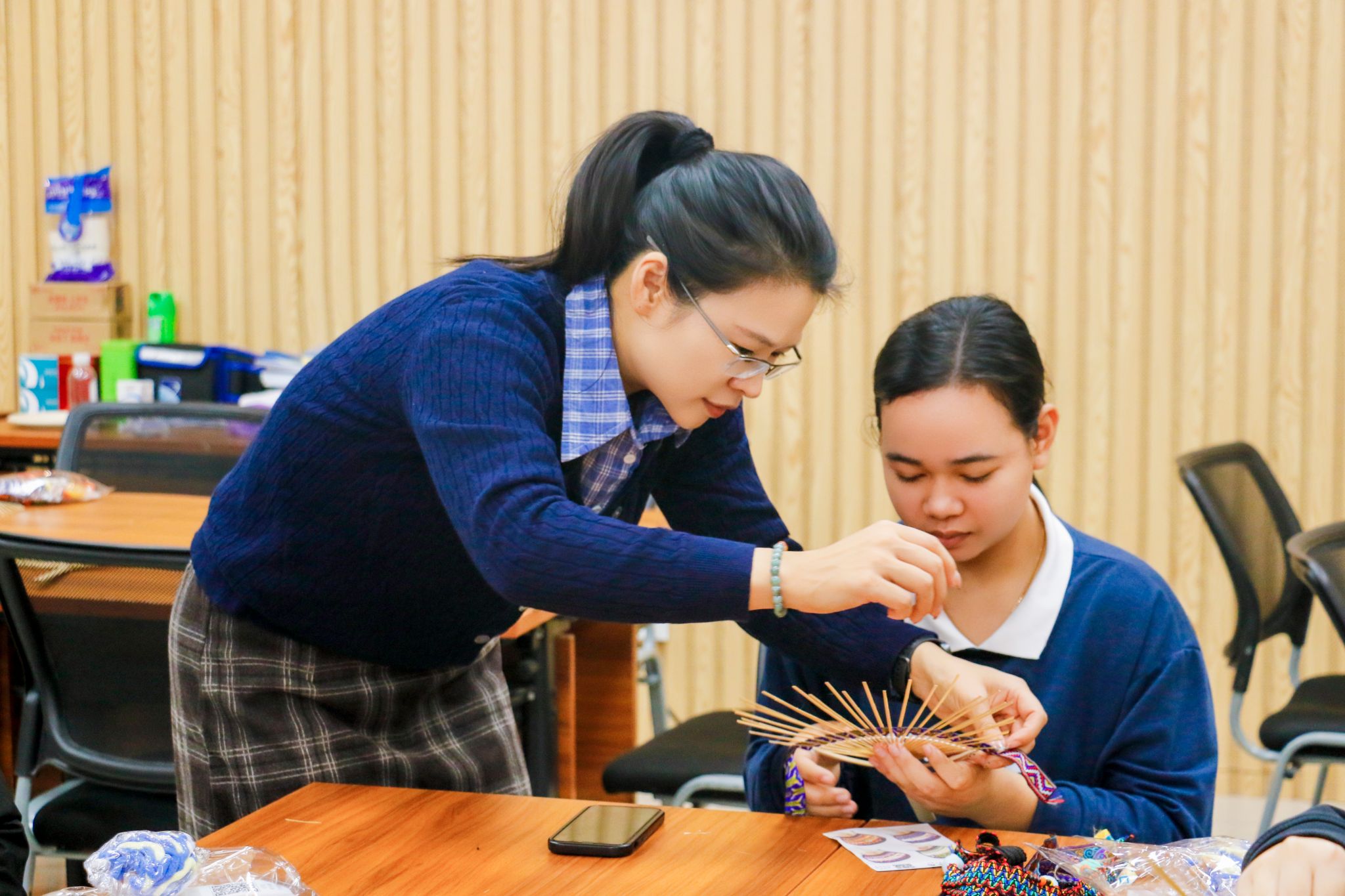 院长助理李文娟指导留学生制作壮锦扇