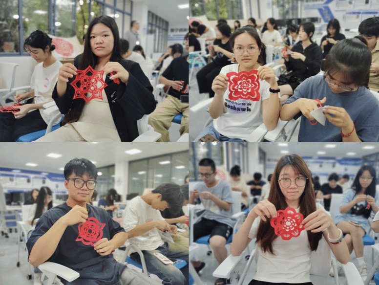 在讲座中,钟昀睿老师向同学们介绍了剪纸艺术的起源、发展历史及其在中国传统文化中的重要地位,并通过示范详细讲解了剪团花的步骤和技巧要点。随后,同学们亲自动手,跟随老师的指导进行剪纸实操,体验传统剪纸艺术的魅力。通过生动的演示和互动,同学们不仅了解了剪纸的基本技艺和技术要点,还深入体验了剪纸艺术所蕴含的传统文化和艺术魅力。23造价(水利)1班的张云潇同学很有感触地说:“剪纸是中国非物质文化遗产,透过一幅幅作品,我看到了中国人民丰富多彩的生活场景,以及对美好生活的向往。今天在钟老师的教导下,自己动手制作剪纸,栩栩如生的手工作品展现在面前,特别有成就感。”