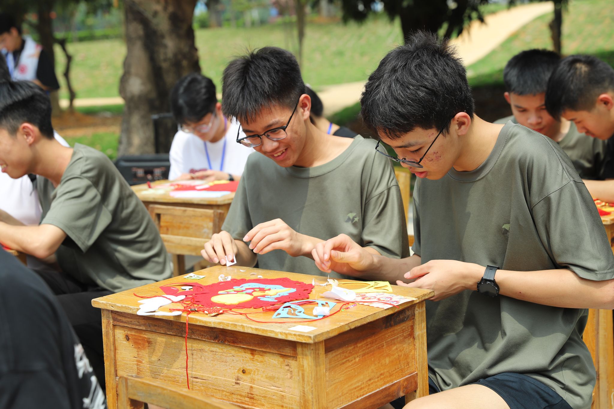 活动现场内容丰富,华侨中学的师生们积极地参与到活动中来。土木建筑工程学院团委书记莫潇娉带领水电学子为华侨中学带去了木构建筑宣讲、非遗扎染手工技艺体验、非遗醒狮挂件制作、非遗手工艺品展示等活动内容。在木构建筑宣讲环节,同学们惊叹木构建筑的榫卯技艺,纷纷聚集在模型周围观看拆解、拼接过程。在非遗扎染环节,同学们亲手参与制作扎染服饰。在非遗醒狮挂件制作环节,同学们被精美的非遗醒狮挂件吸引,工作人员将同学们两两分为一组,并指导他们制作挂件。在非遗手工艺品展示环节,同学们认真了解民族工艺品魅力的同时,还参与现场工作人员组织的民俗百科知识小问答,赢得精美小礼物。