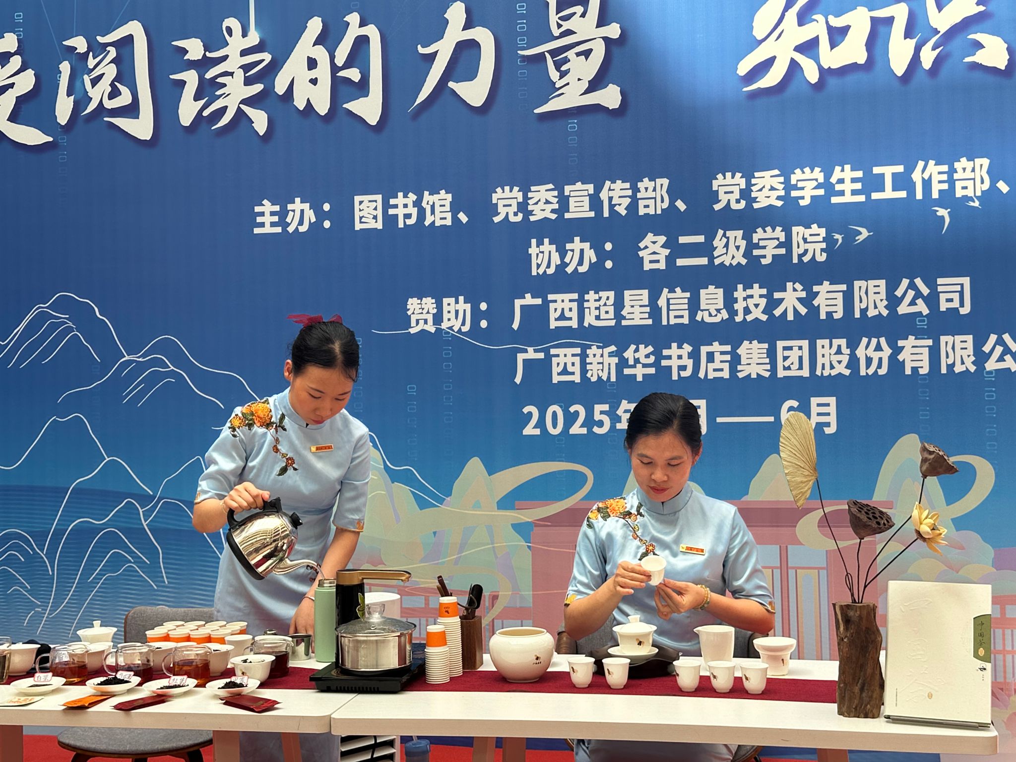 [本网讯]为弘扬中华优秀传统文化,丰富校园文化生活,提升学生对茶文化的认知与实践能力,4月25日下午,学校图书馆在里建图书馆一楼大厅成功举办了“茶文化知识讲座”。本次活动特邀八马高级茶艺师韦娴担任主讲嘉宾,吸引了电力工程学院、交通工程学院、自动化工程学院共150名学生代表参与。