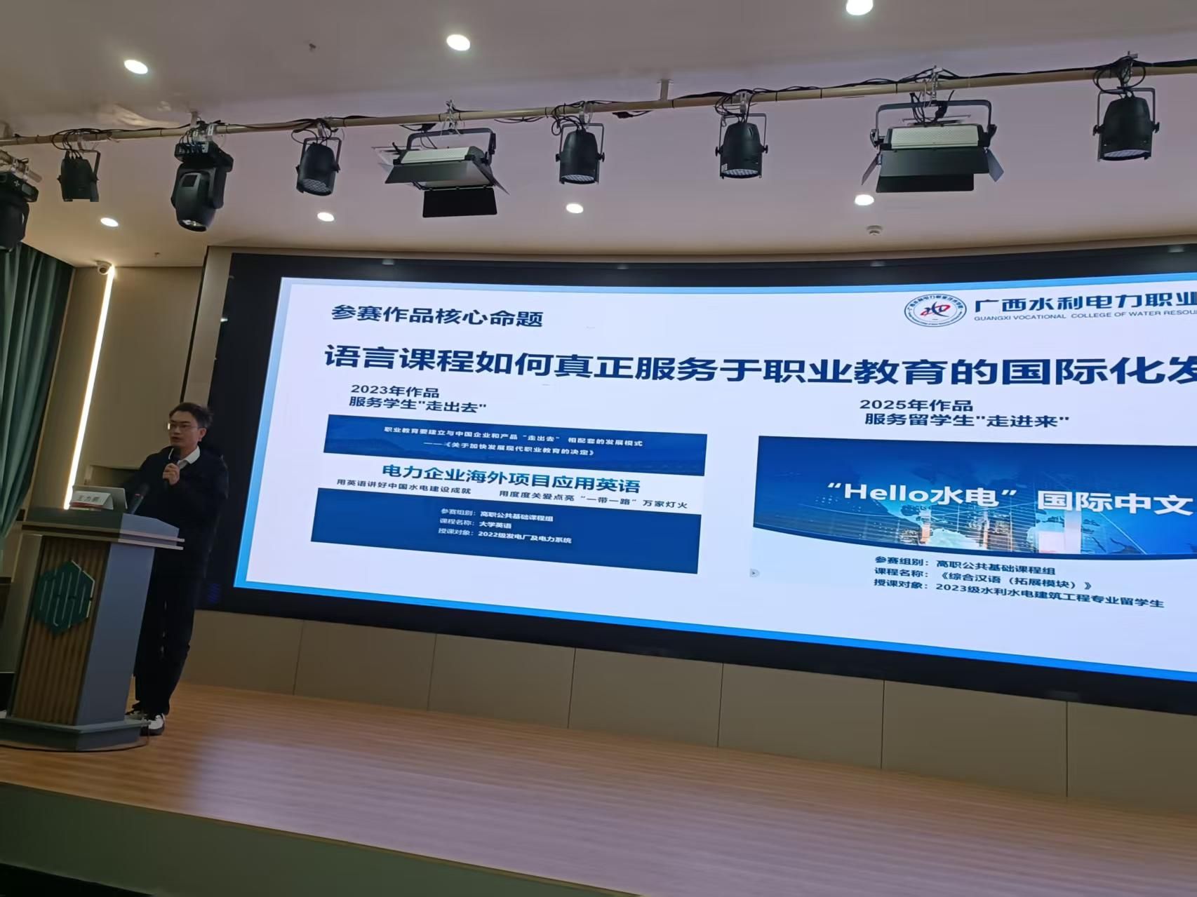 王力鹏以自治区教学能力大赛一等奖作品——《电力企业海外项目应用英语》与《“Hello 水电”国际中文》为例,阐释语言课程如何从“公共课”转向“服务专业、服务国际化”。他围绕课程重构、技术赋能、思政融合等方面,分享了“以赛促教、以赛促研”的实践路径。