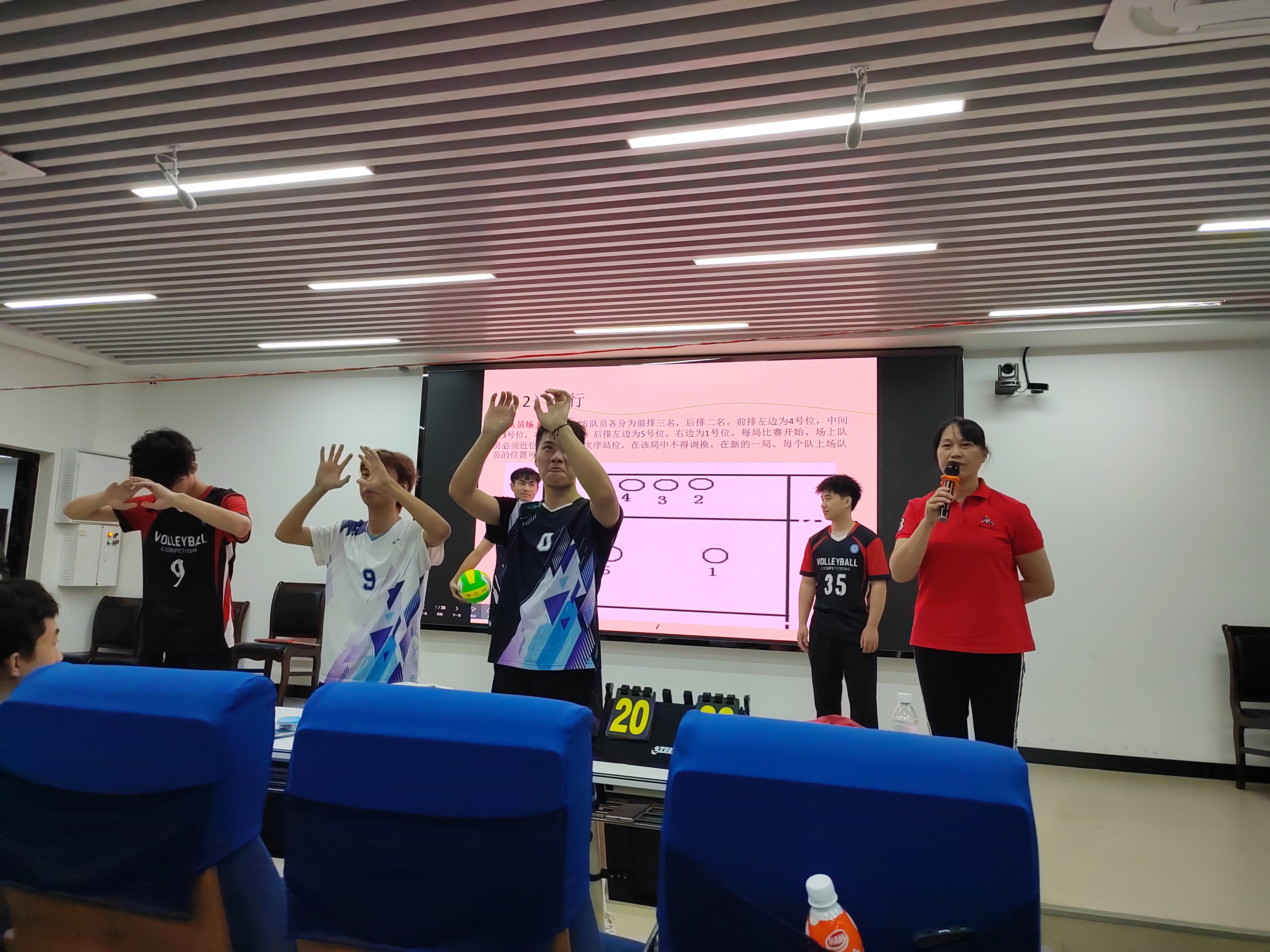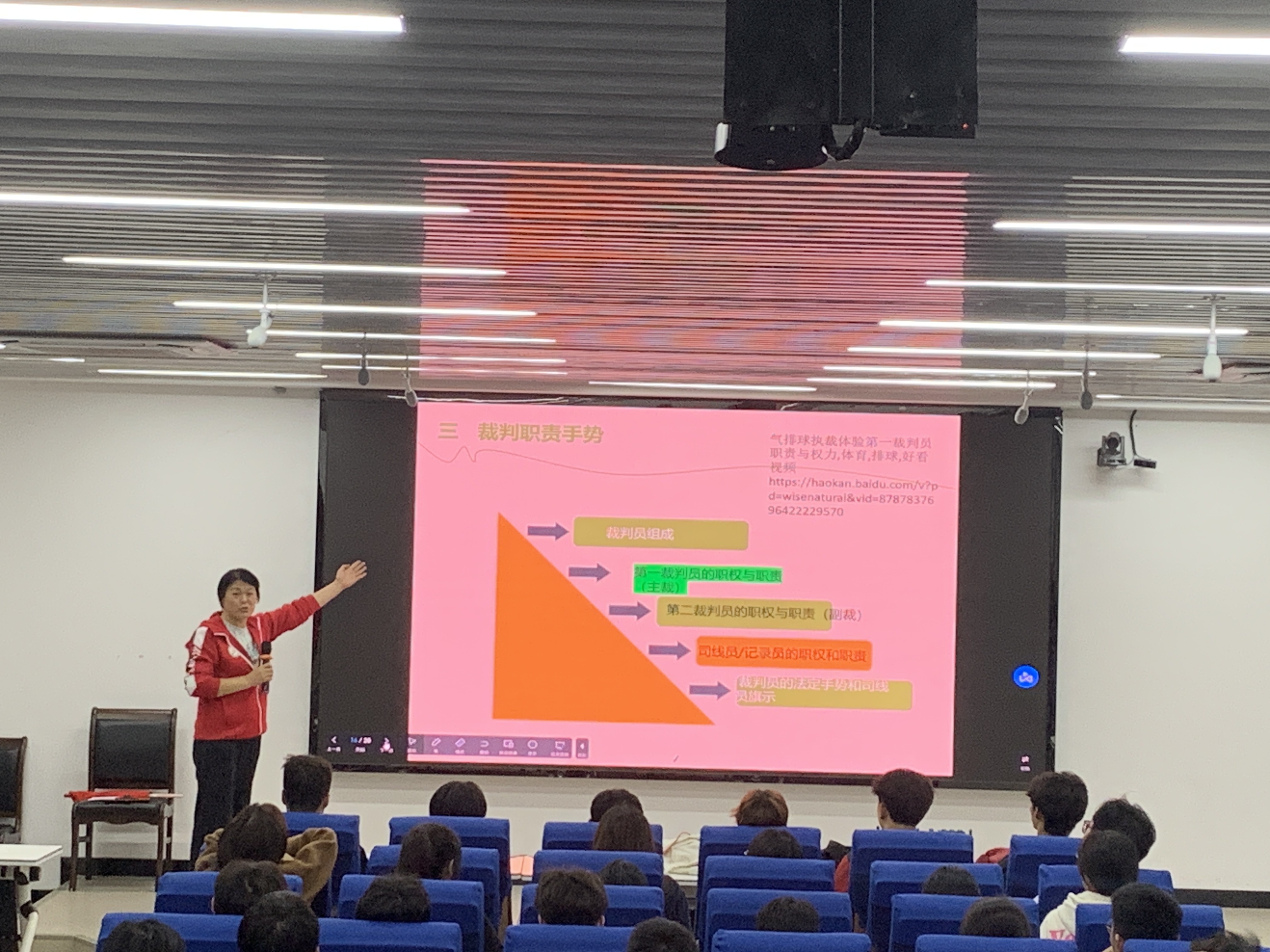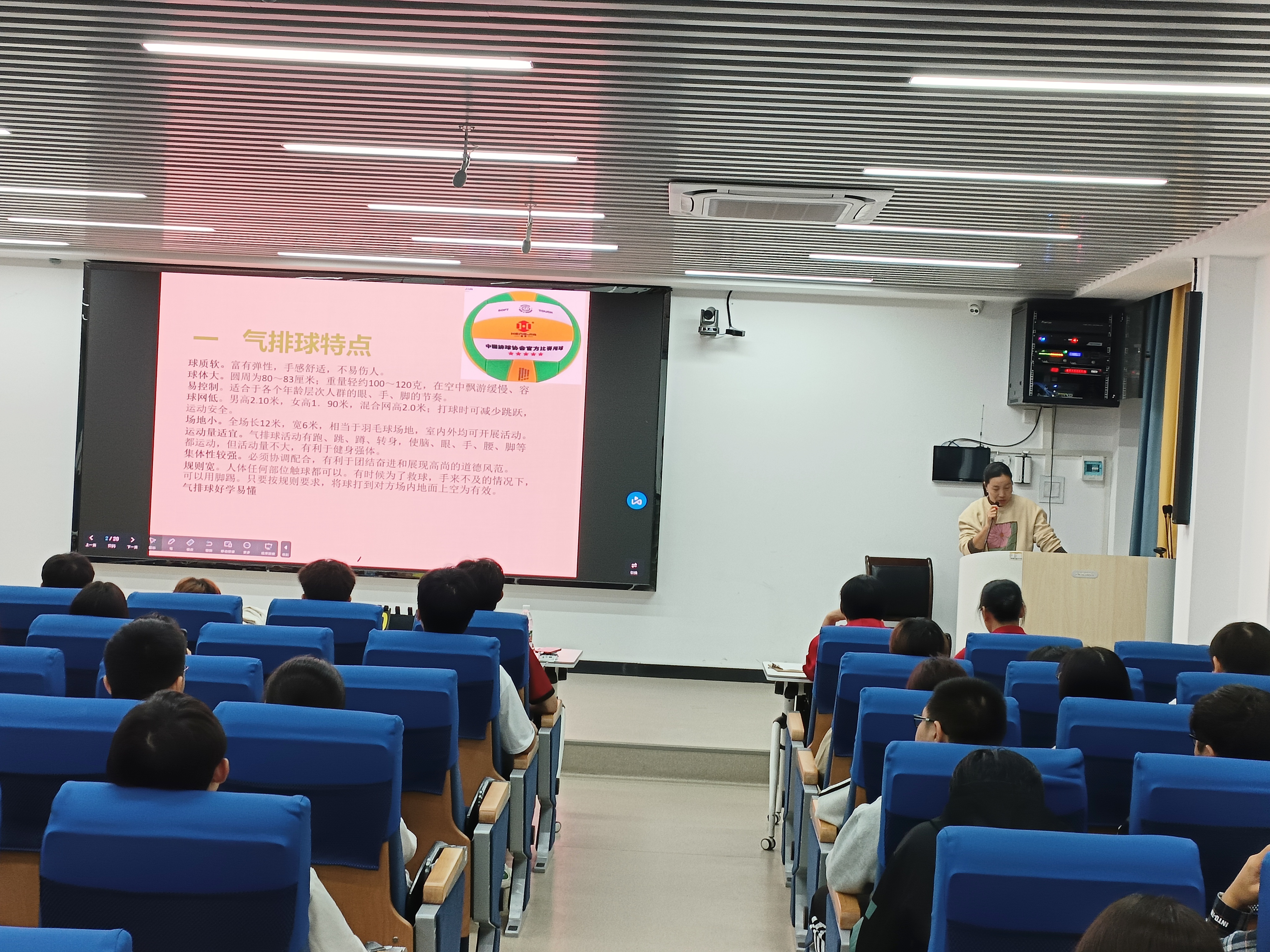 三位老师结合多年体育课堂教学经验、学生气排球训练及竞赛经验,分别从竞赛视频分解动作讲解、现场真人演示、师生问答互动等不同的角度,对气排球的项目特点、场地要求、比赛规则、裁判职责手势进行了生动精彩的解析。现场师生互动频繁,学习气氛活跃、学生听得津津有味,不时响起热烈的掌声。