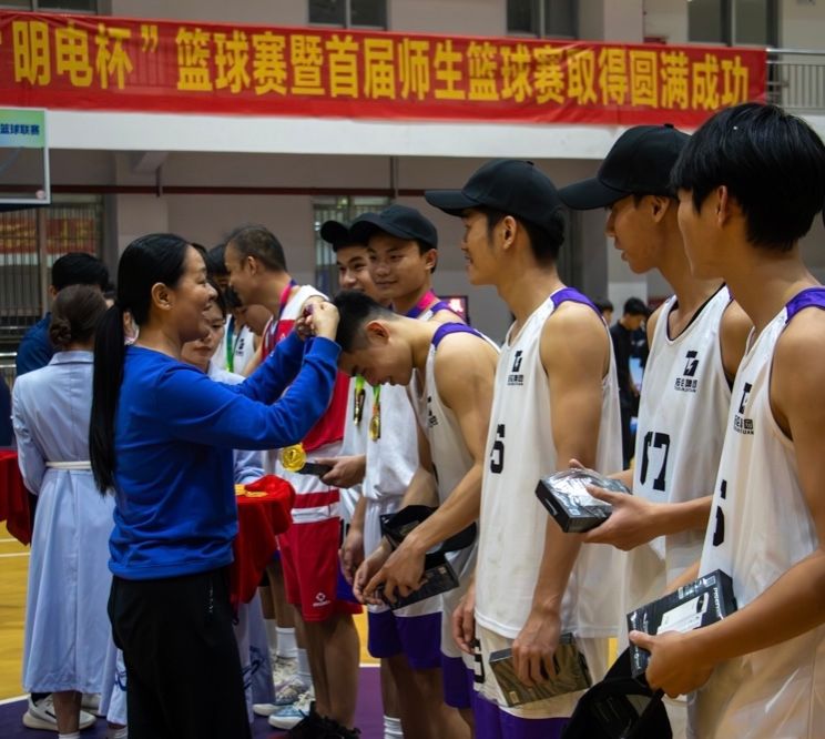莫海燕和陈军共同为冠军队伍颁发奖牌和奖金,第五届“明电杯”男子篮球赛暨首届师生篮球赛圆满落下帷幕。