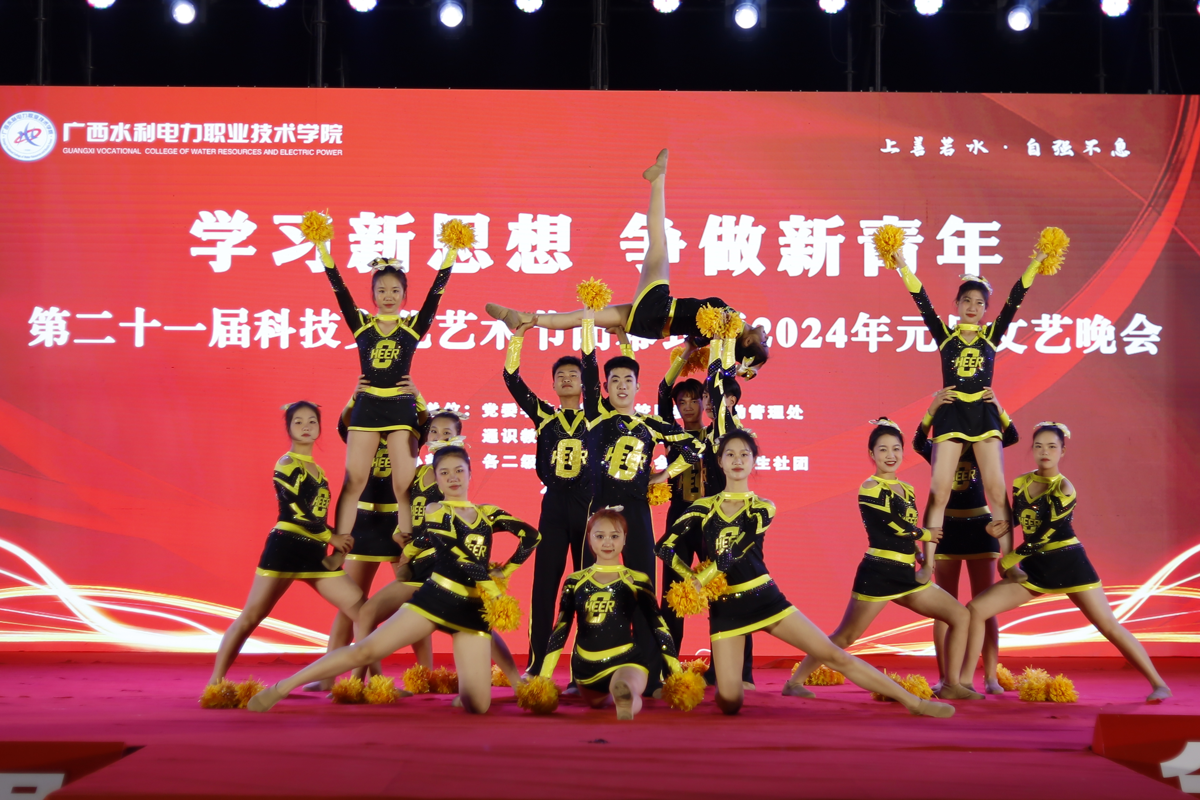 晚会分为《重引领,强底气》《创品牌,领风气》《树典型,扬正气》《提心气,聚朝气》四大篇章。晚会在学校龙狮协会的《龙腾盛世,国富民安》节目拉开序幕,第一篇章展现了近年来学校持续深入培育和践行社会主义核心价值观,强化文明培育、文化实践和品牌创建,厚植文明沃土,涵养时代新风。第二篇章在《“静湖之星”十佳大学》获奖代表风采展示中开启,AC米兰大学生体育舞蹈协会带来的节目《全民规定健美操》《集体花球自选动作》和南宁师范大学体育学院的《小团体技巧自选动作》啦啦操节目,展示了新时代青年学生的青春活泼、积极向上的精神风貌和独特魅力,通识教育学院的《走进数学建模》知识课堂展示,体现了AC米兰全方位培养学生综合素质。 打造“一校一品”活动,持续开展“科技校园文化艺术节”、校园十大歌手比赛、红歌比赛、诵读大赛、篮球精英赛等活动,不断激活水电师生创作积极性和参与性,学校一系列精神文明创建活动百花齐放、成风化人、引领风尚。第三篇章里马克思主义学院的《乡村振兴战略视角下广西桂林毛竹山村的现状调查》情景解说、社会实践成果展示、校友之约《广西青年爱广西》等节目,展现了水电师生“自强不息”的奋斗姿态,常态长效开展先进典型、道德模范等选树培育、学习宣传,广泛展现了先进典型迎难而上的勇气、主动作为的志气、开拓创新的锐气。第四篇章由后勤管理处以及物业工作人员带来的《绿色环保时装秀》、广西经济职业学院的歌伴舞《奔跑的青春》、广西制造工程职业技术学院的独唱《我在人民广场吃炸鸡》、广西幼儿师范高等专科学校的群舞《美丽的壮锦》,多校学生共同精彩亮相,带来精彩纷呈的节目。