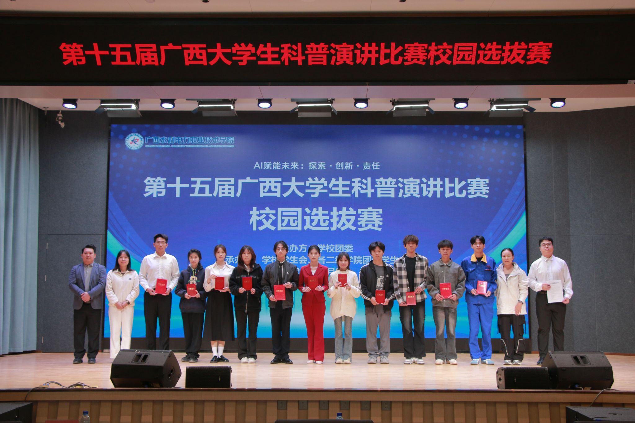 在统分间隙,现场还设置了趣味科普有奖问答环节,围绕“生成式AI”“弱人工智能”及“AI医疗应用”等知识点与观众互动,气氛活跃,进一步普及了科学知识。经过激烈角逐,比赛最终评选出一、二、三等奖及优秀奖若干名,来自水利工程学院的李佳豫和电力工程学院的覃芳梅斩获一等奖,并获推至南宁市参赛。评委老师分别为获奖选手颁奖并合影留念。所有选手的精彩表现,赢得了现场观众的阵阵掌声。