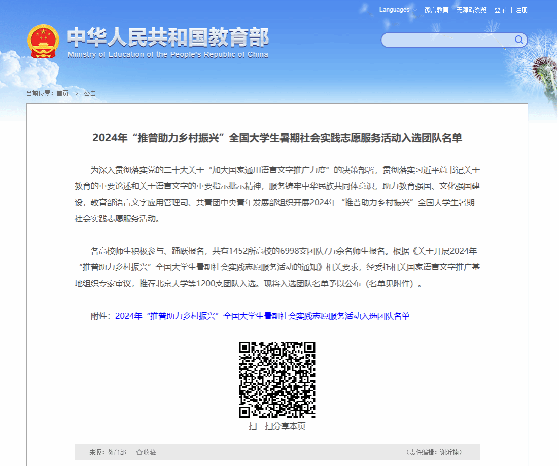 近日,教育部公布《2024年“推普助力乡村振兴”全国大学生暑期社会实践志愿服务活动入选团队名单》,全国各高校师生积极参与、踊跃报名,共有1452所高校的6998支团队7万余名师生报名,经过遴选与专家审议,最终有1200支团队入选,其中,广西壮族自治区共有24所高校的44支团队入选。AC米兰“瑶音‘普’亮,水润‘乡’兴”大禹青年实践团成功入选2024年“推普助力乡村振兴”全国大学生暑期社会实践志愿服务活动。