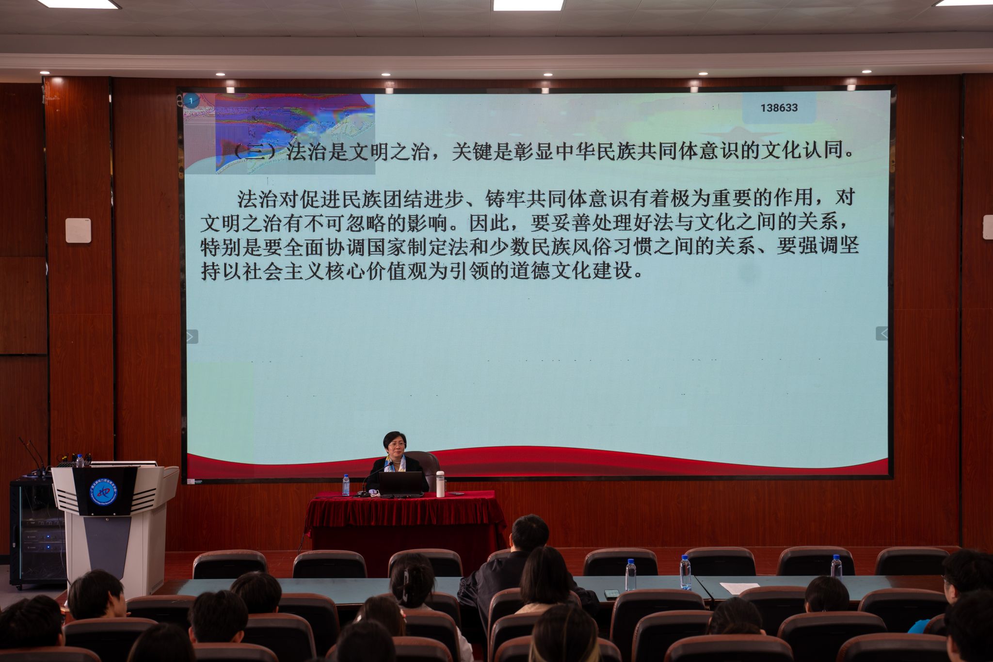 谭洁教授以“铸牢中华民族共同体意识的法治逻辑”为核心,结合生动案例,系统阐释了法治在维护民族平等、促进民族团结、保障民族发展中的关键作用。她对相关法律法规的实践要求进行了深入解读,帮助学员准确把握铸牢中华民族共同体意识的法治内涵。她特别强调,法治与清廉品格相辅相成,并叮嘱学员们作为学生骨干,应当从日常实践做起,坚守法治底线、涵养清廉自律的作风,在与各族同学相处、参与校园民族文化交流等活动中,秉持公正友善的态度,以清廉自律的作风助力营造团结和谐的校园氛围。