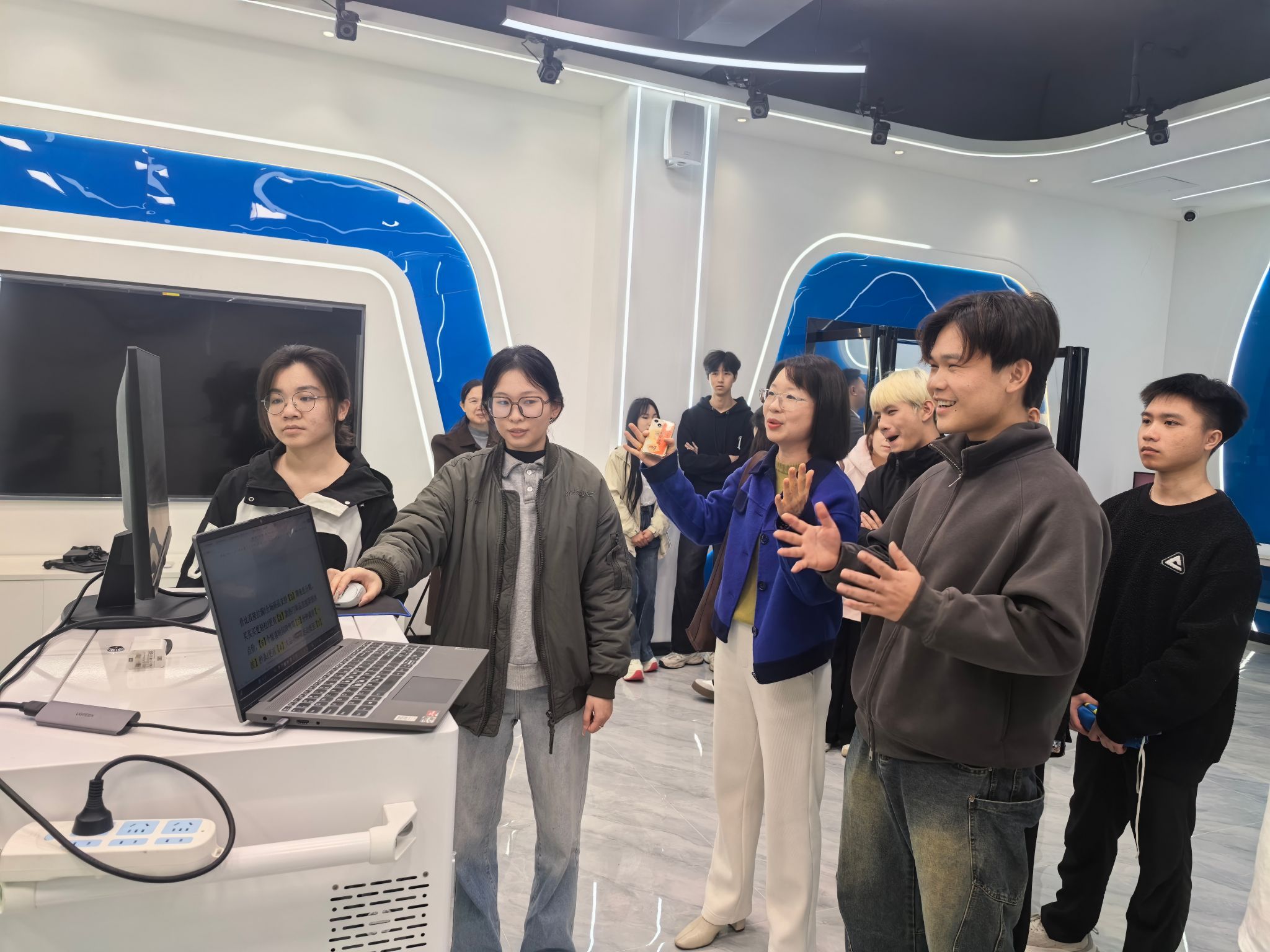 活动首站,师生一行来到广西大学虚拟现实创新实验中心,深入了解了虚拟现实(VR)技术的研发进展与行业应用场景。在实验中心技术人员的讲解下,师生近距离观摩了VR技术在工业设计等领域的创新成果,直观感受到虚拟现实技术对数字化转型的推动作用,更体验到前言技术赋能产业领域的创新应用,架起从课堂到产业的认知桥梁。