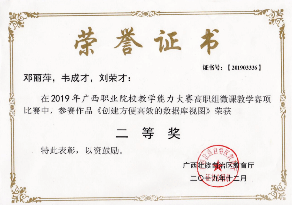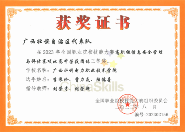 2.信息安全管理与评估:《信息安全管理与评估》连续 5 年位居广西榜首,在国赛中荣获三等奖 3 项。