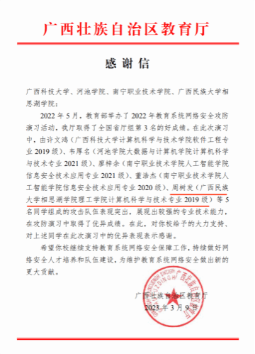 众多优秀毕业生凭借扎实的专业知识和突出的综合素质,在升学与就业道路上成绩优异。其中,周树发同学在校期间荣获广西职业院校技能大赛《信息安全管理与评估》一等奖(广西第一),升本期间在全国教育护网行动中表现突出,荣获全国第三名,并多次获得教育部、广西教育厅、广西军区的发函致谢,同时顺利考上广西科技大学研究生。