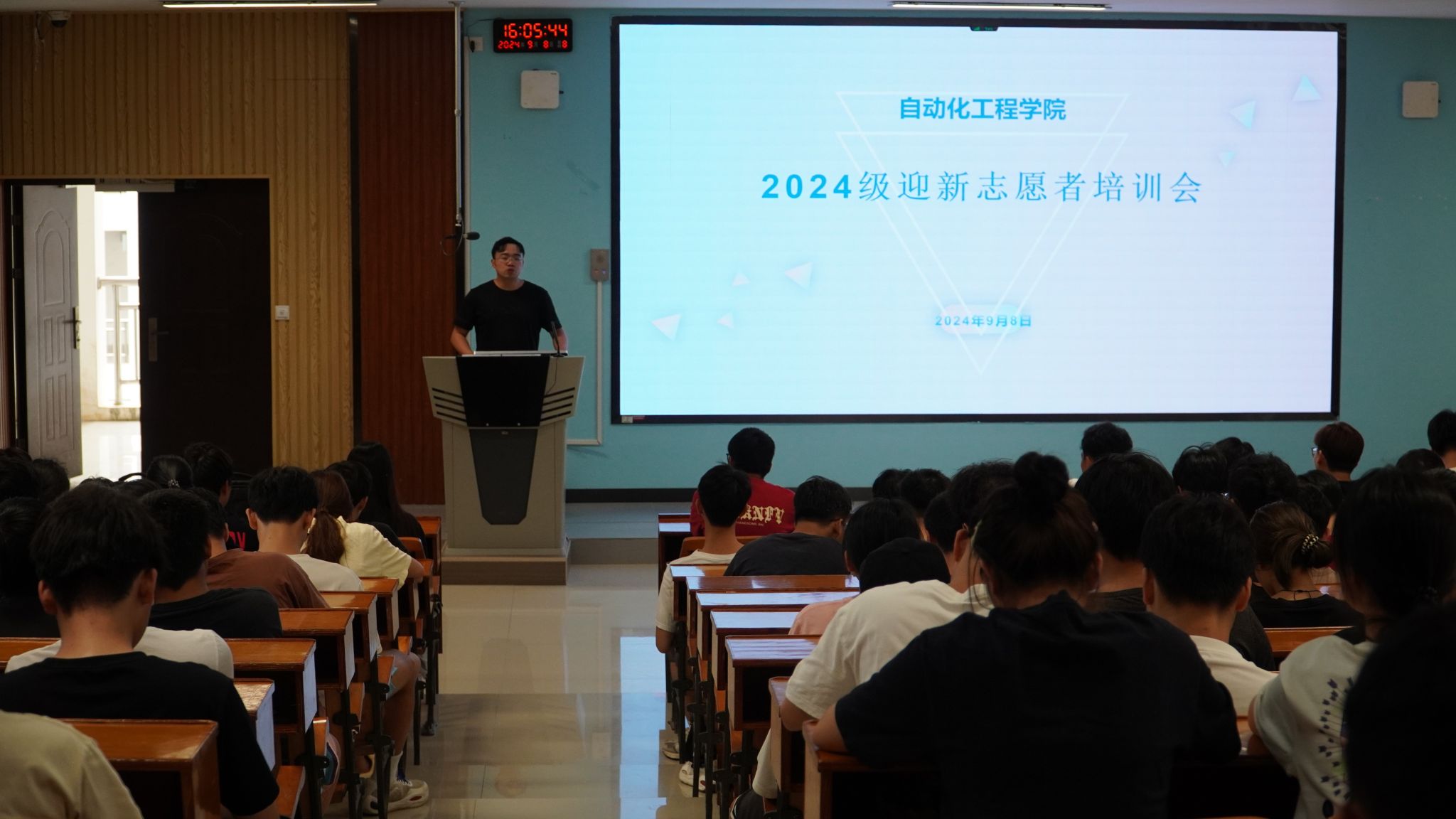 【本网讯】2024年9月8日,自动化工程学院团委林睛岚老师在里建教学楼阶梯教室,组织全体迎新志愿者开展迎新工作培训。