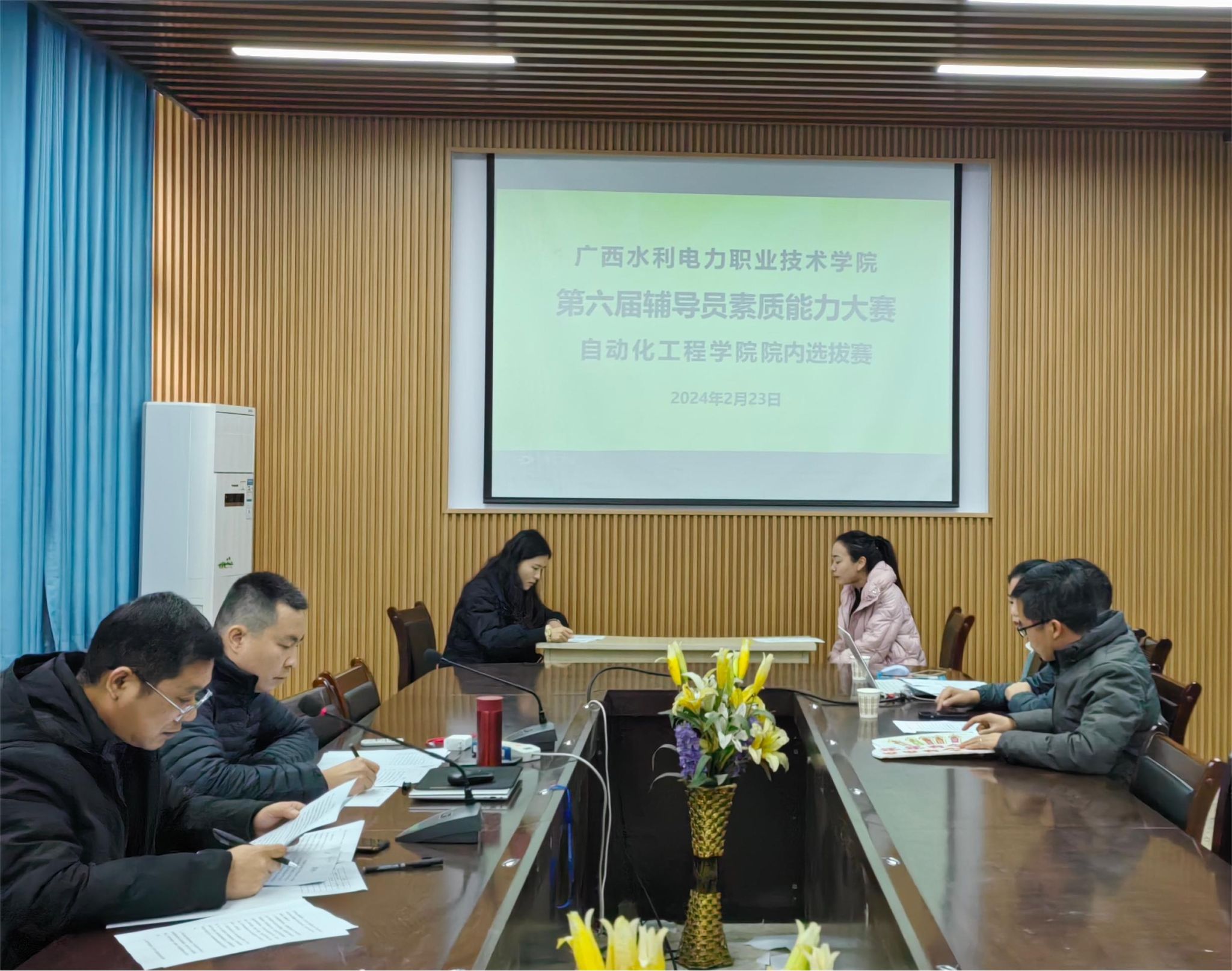 [本网讯]为贯彻落实全国高校思想政治工作会议精神,加强辅导员队伍建设,提升辅导员队伍理论水平和素质能力,推动学院思想政治工作高质量发展,2月23日,自动化工程学院在长堽校区学院会议室举办第六届辅导员素质能力大赛学院选拔赛。自动化工程学院党总支书记石庆华、副院长包毅、办公室主任谢玉卿担任评委,全体专兼职辅导员到场参加比赛。